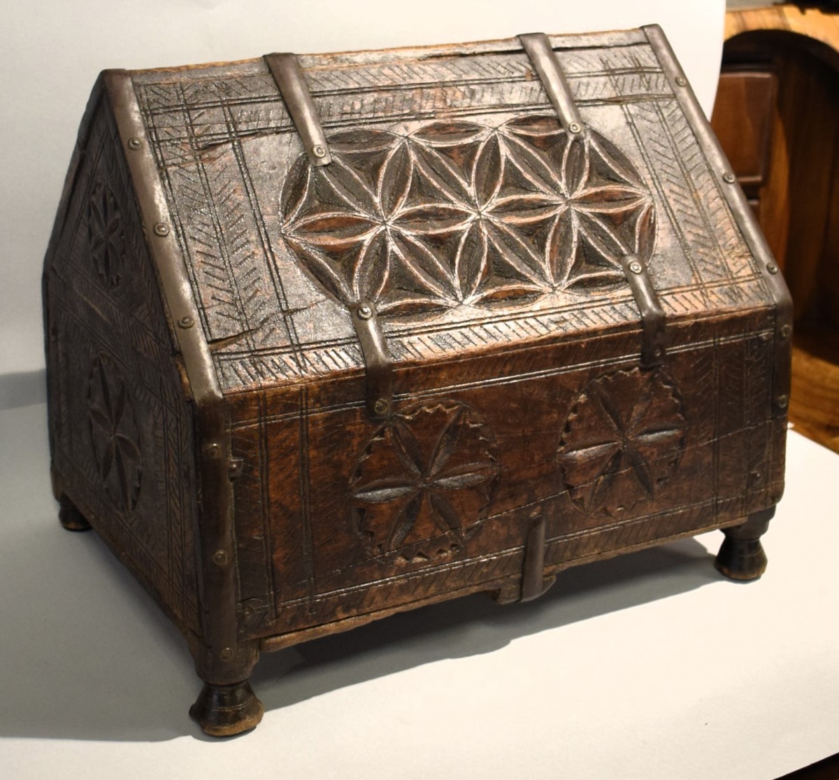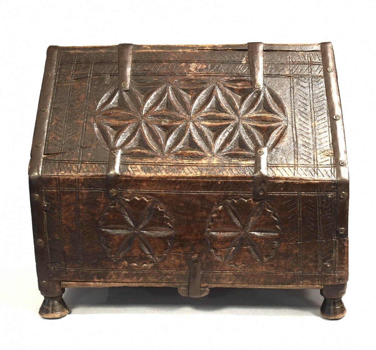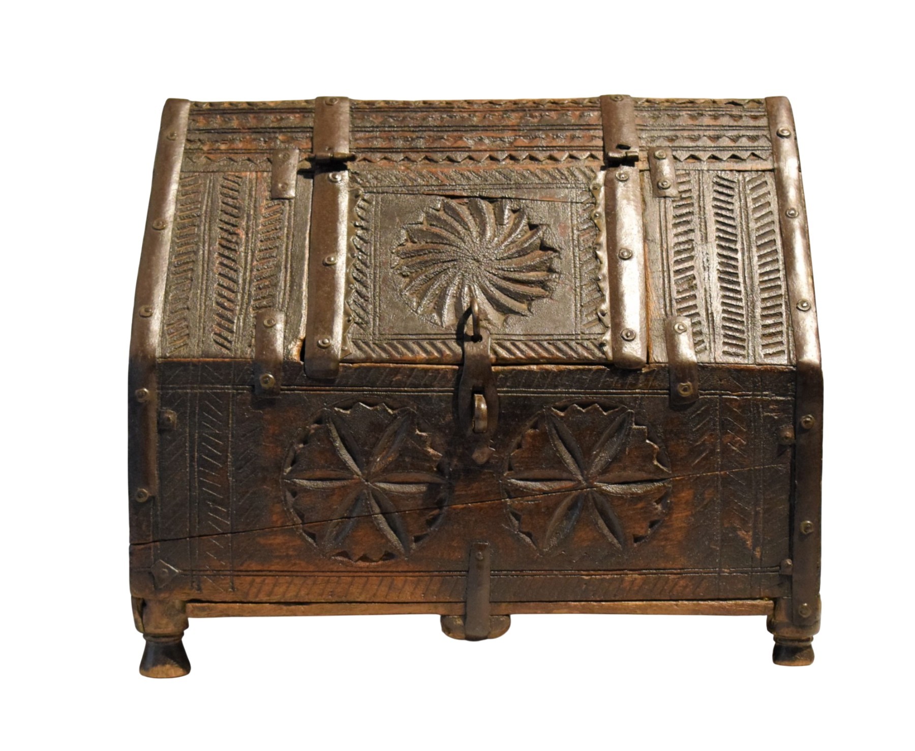 Rare and fascinating wooden dowry box, entirely carved with archaic propitiatory motifs. It comes from the Indian region of Rajasthan and was used to contain the jewels that the bride's family gave as a dowry for her daughter's wedding. The particular shape of this precious container is typical of Mughal tradition, with the small door that opens in the central part of the roof-shaped lid. The box is in excellent condition with a splendid patina of time and is original in all its parts, without any restoration.