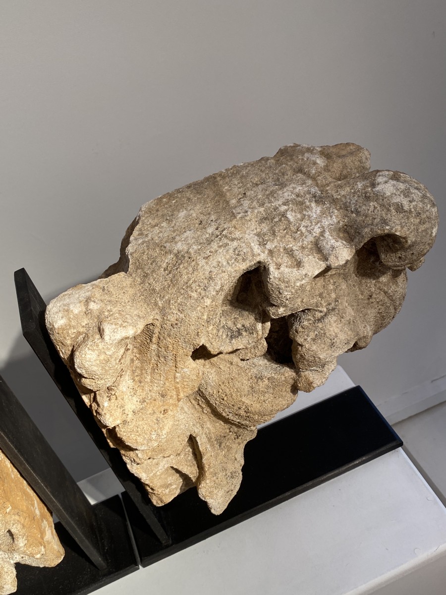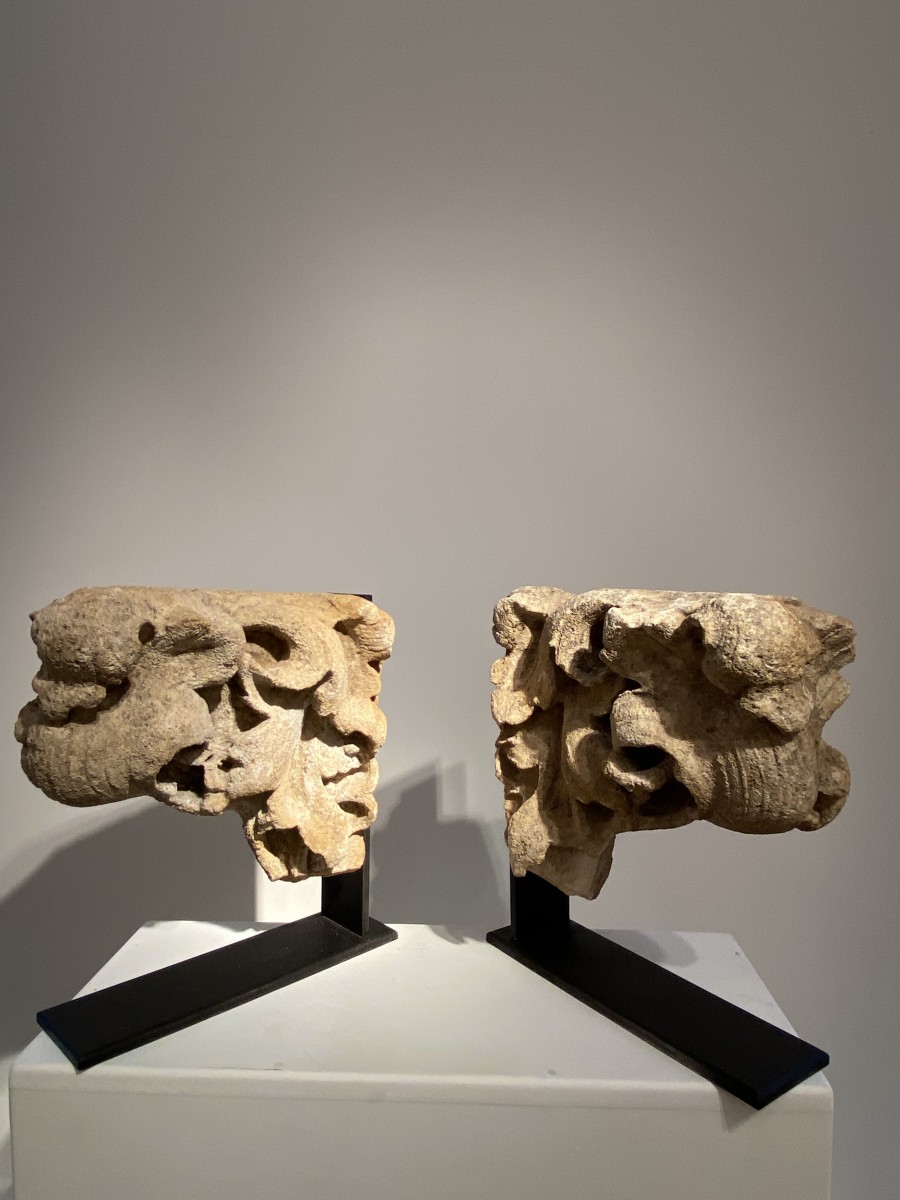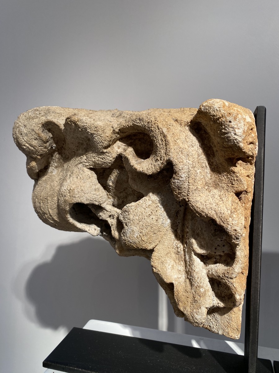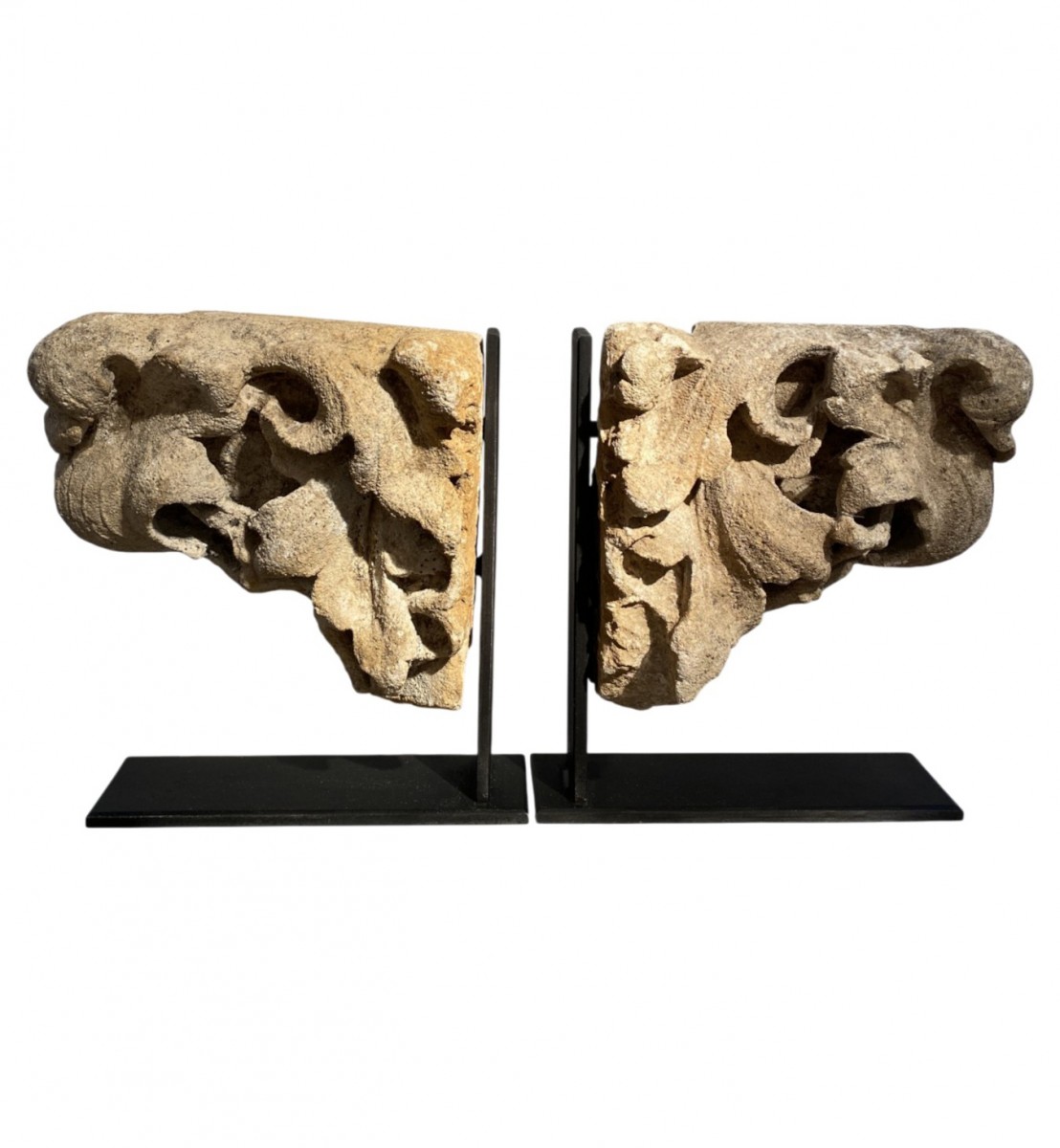 Two French limestone cornerstones voluptuously sculpted with acanthus. Excellent condition (not broken). Highly poetic. On metal stand.