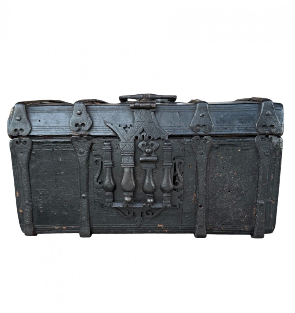 This rare 16th-century casket is constructed from wood, covered in leather, and reinforced with finely wrought iron mounts. The exterior is richly adorned with hand-forged iron straps, hinges, and an elaborate front lock plate, displaying characteristic Renaissance decorative motifs. The robust ironwork not only served a protective function but also reflects the high level of craftsmanship associated with Spanish chests of the period.