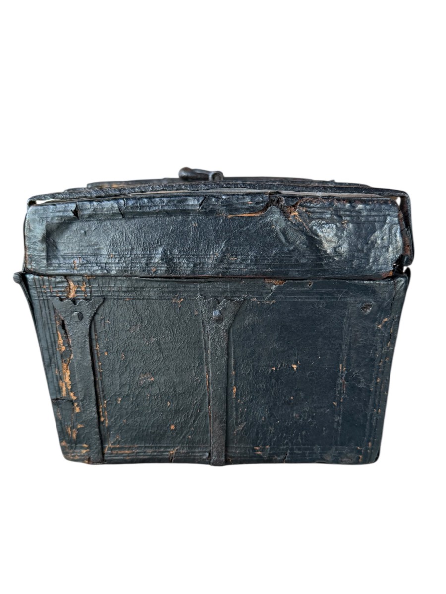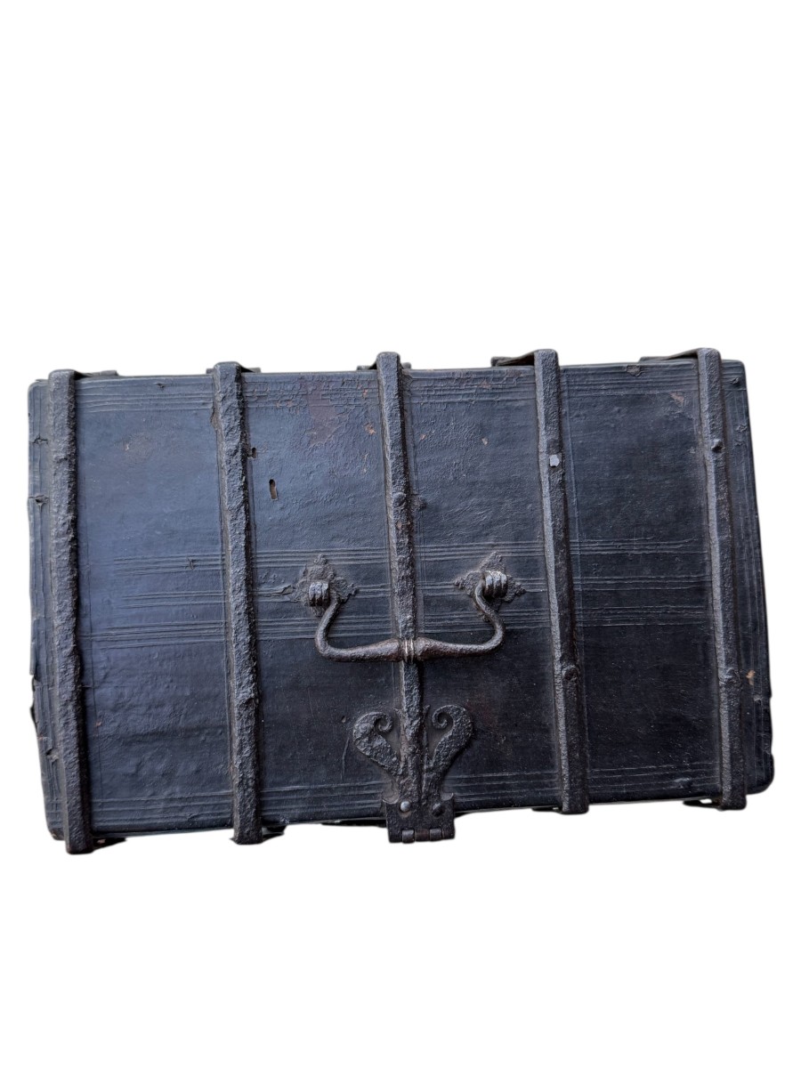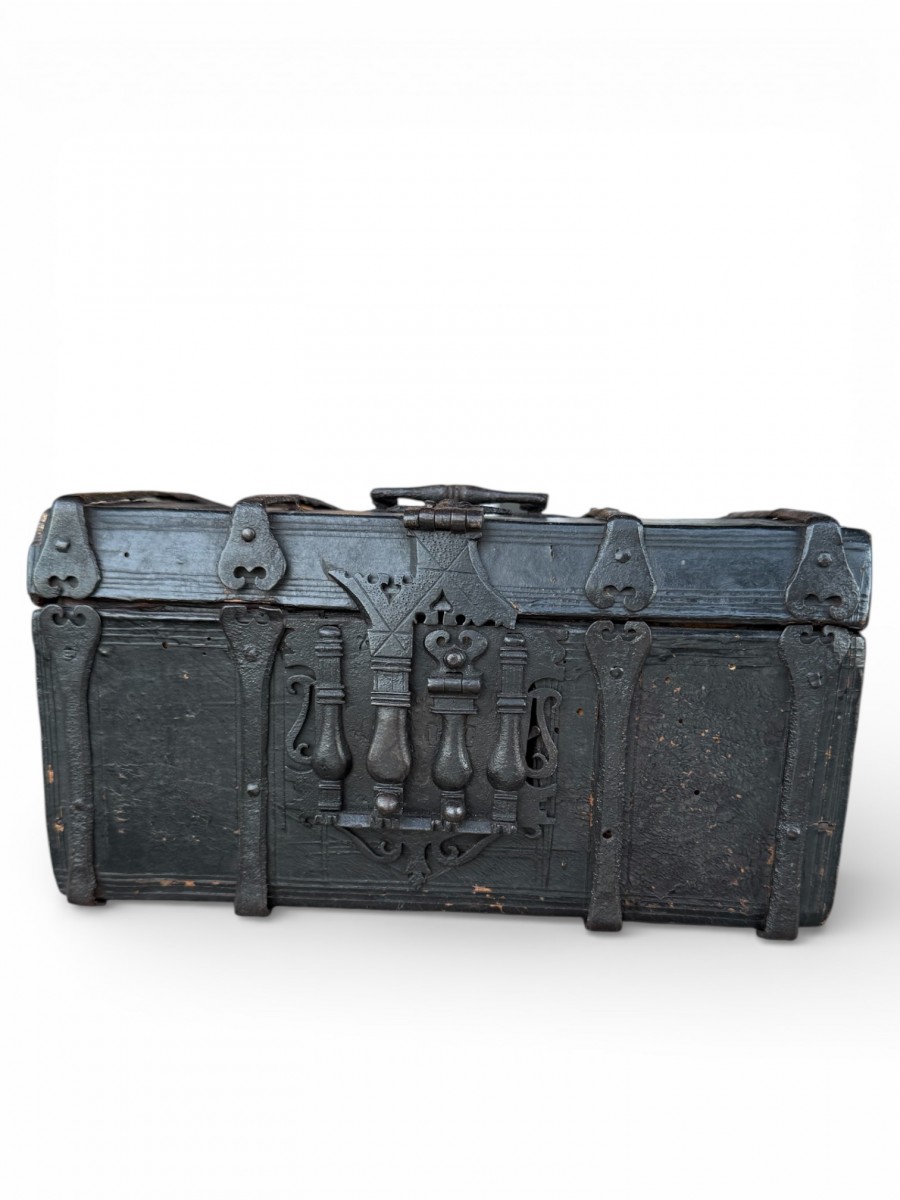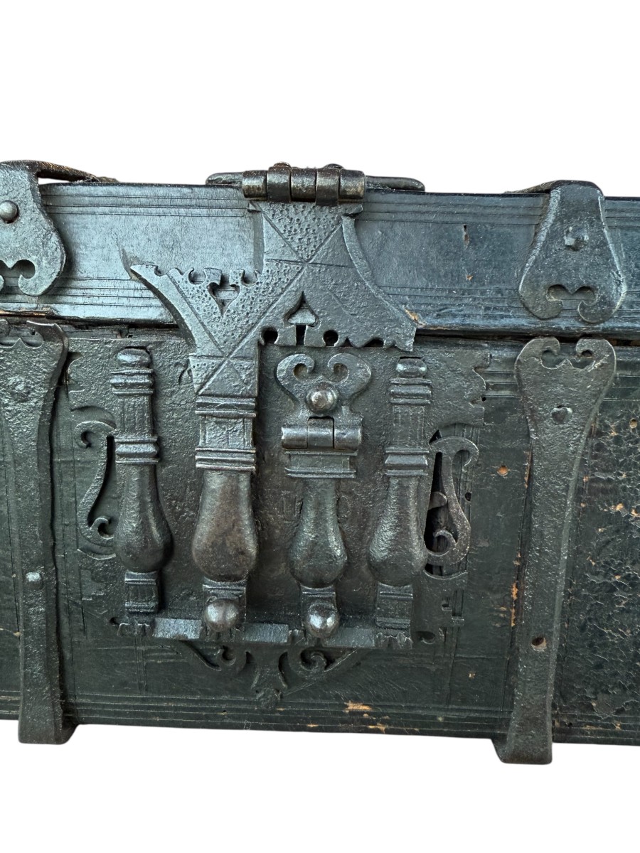 Such caskets were typically used for the safekeeping of valuables, documents, or textiles and were often portable. This example stands as an evocative survival of early modern craftsmanship, combining utility, durability, and decorative ambition.