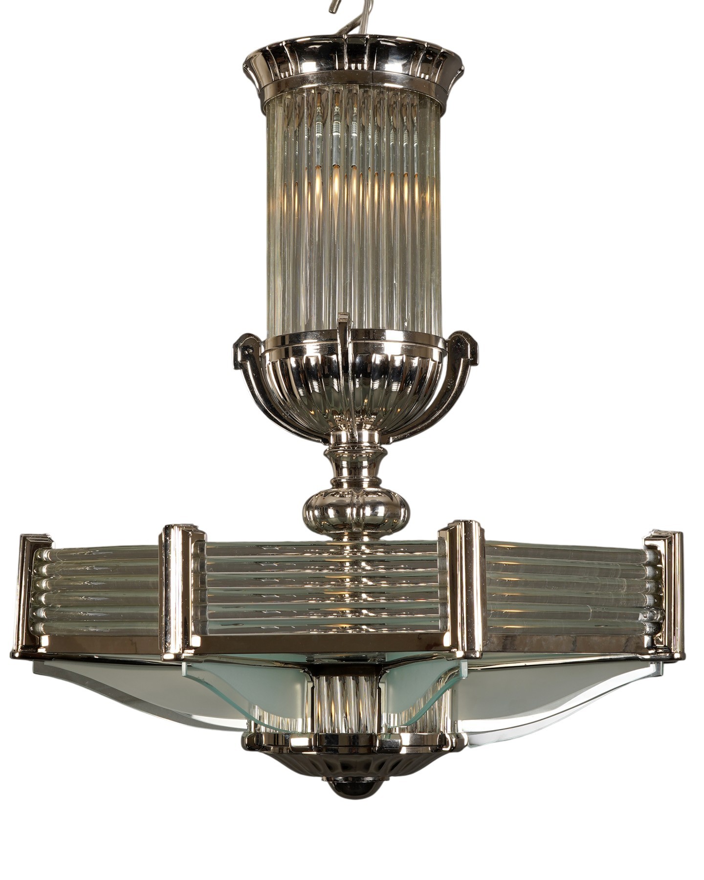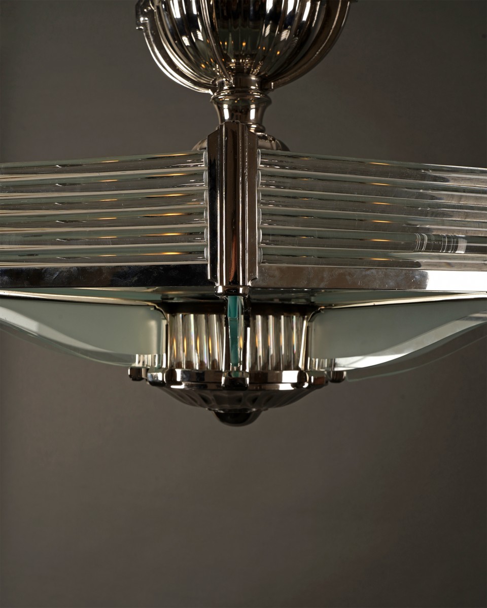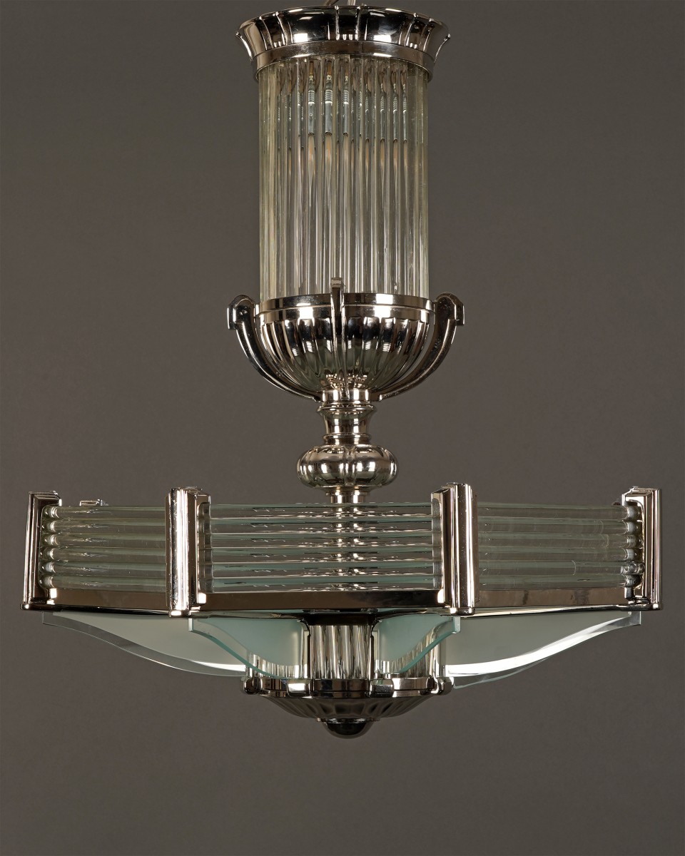 Fine nickel-plated bronze octagonal shaped Art Deco chandelier with eight lights, the whole attractively decorated with glass rods and frosted glass panels.