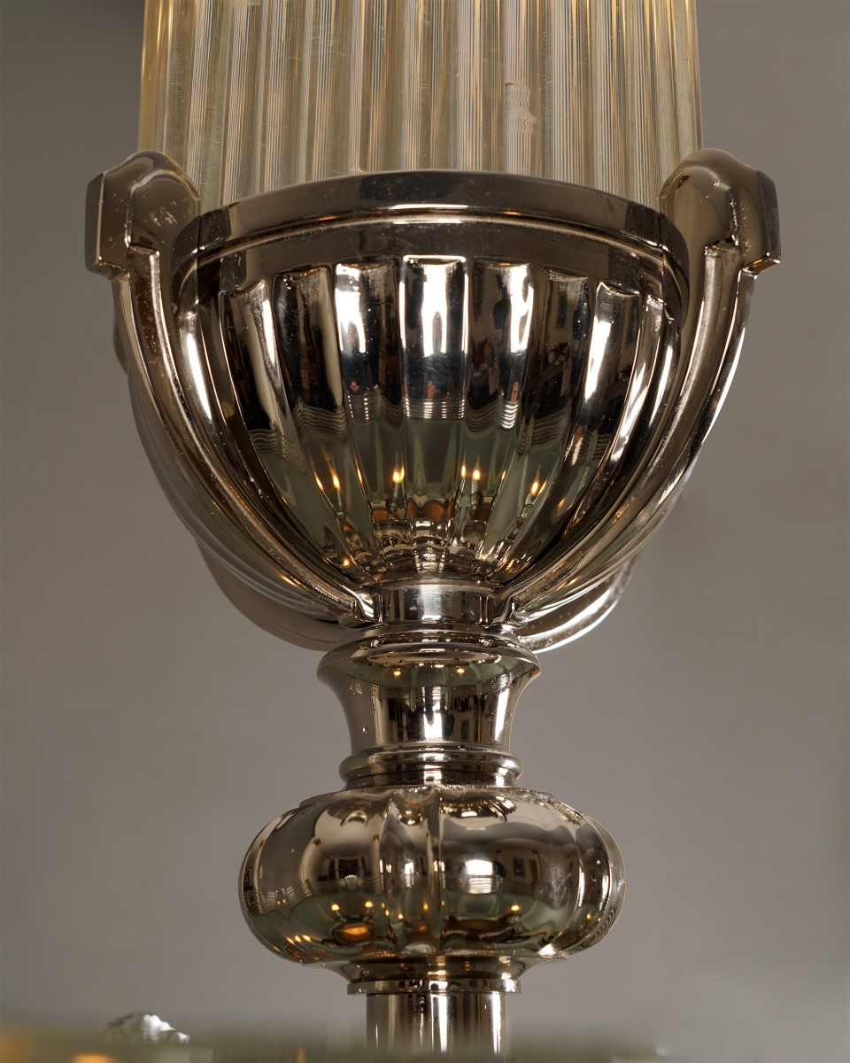 Ateliers Petitot was founded in Paris in 1860 by Eugène Petitot, who began producing standard lighting chandeliers for public buildings, particularly churches. However, the company soon specialized in luxury lighting for private customers, adapting to changing tastes until the 1920s, when they began to produce Art Deco lighting. Indeed, under the impetus of Henri Petitot (1914-1938), several of the company’s flagship models, such as white opal glass chandelier and patinated bronze wall sconces, were created. During this period, Atelier Petitot produced lightings that were both functional and aesthetically pleasing, combining geometric shapes, satin-finish glass and nickel-plated bronze. Petitot chandeliers stand out for their exceptional quality, meticulous finish and innovative design.