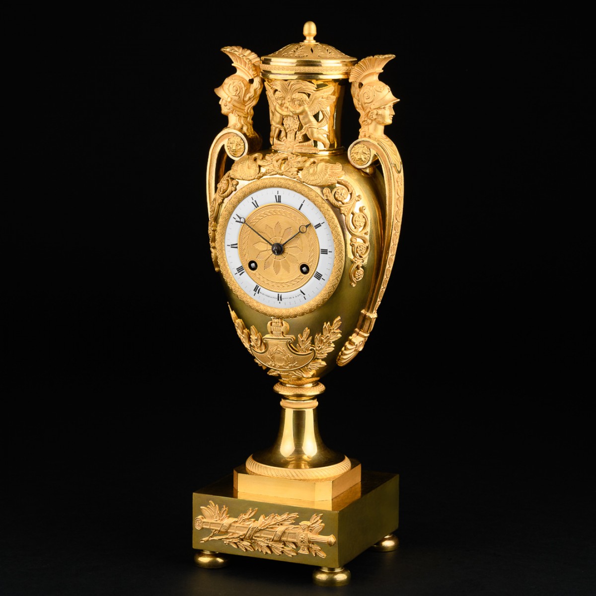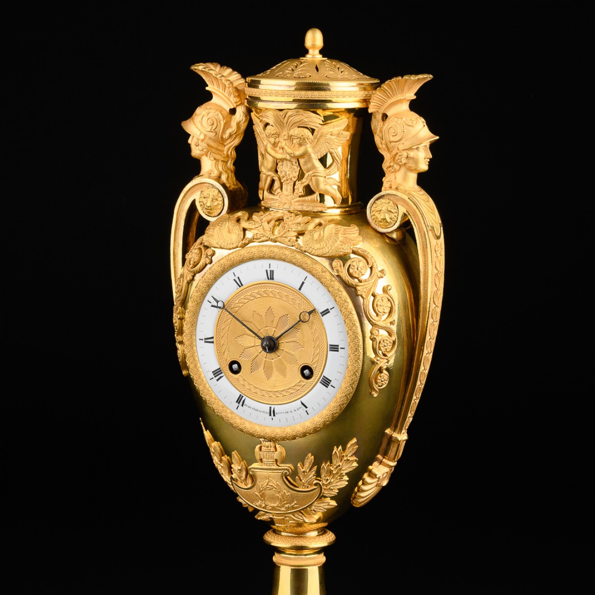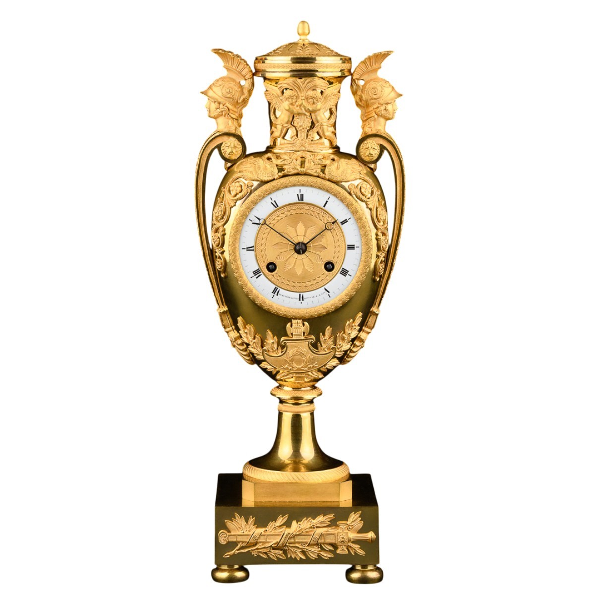 Conceived in the form of an ovoid vase, this distinguished Empire clock with Roman military motifs is exquisitely cast and finely chased in gilt bronze, adorned with a refined repertoire of military and classical motifs characteristic of the period. The lidded top may also serve as an incense or perfume burner. It is fitted with a Paris movement and a dial signed Musy Père & Fils.
