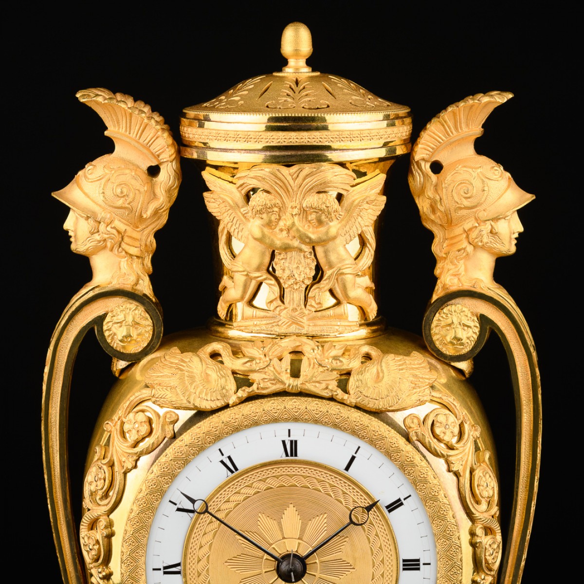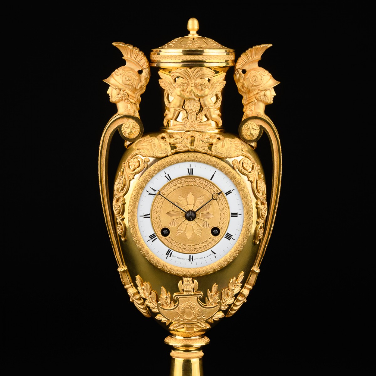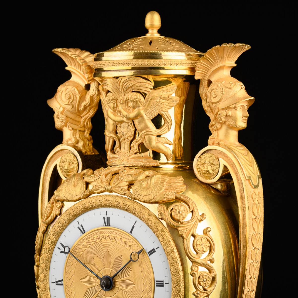 Conceived in the form of an ovoid vase, this distinguished Empire clock with Roman military motifs is exquisitely cast and finely chased in gilt bronze, adorned with a refined repertoire of military and classical motifs characteristic of the period. The lidded top may also serve as an incense or perfume burner. It is fitted with a Paris movement and a dial signed Musy Père & Fils.