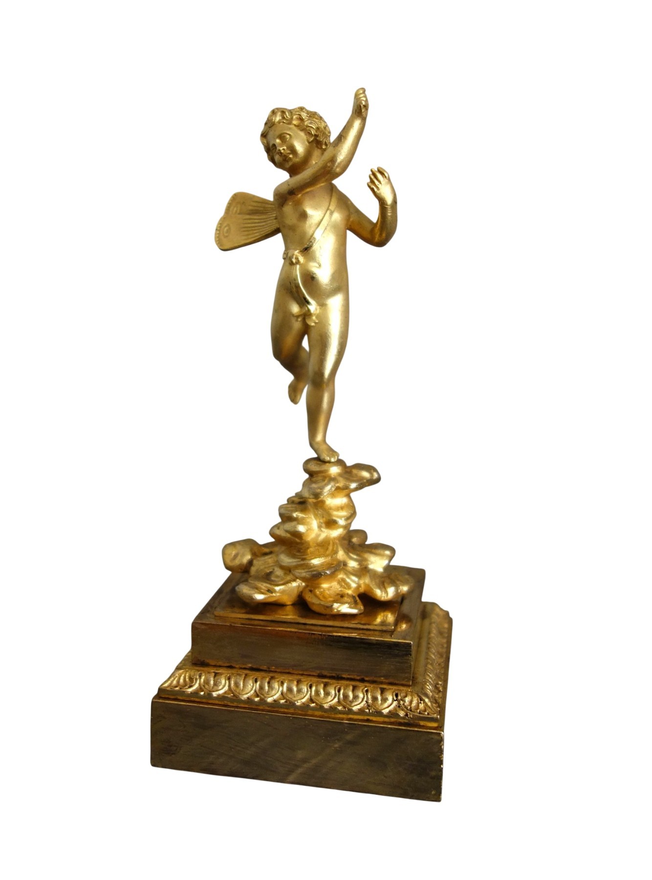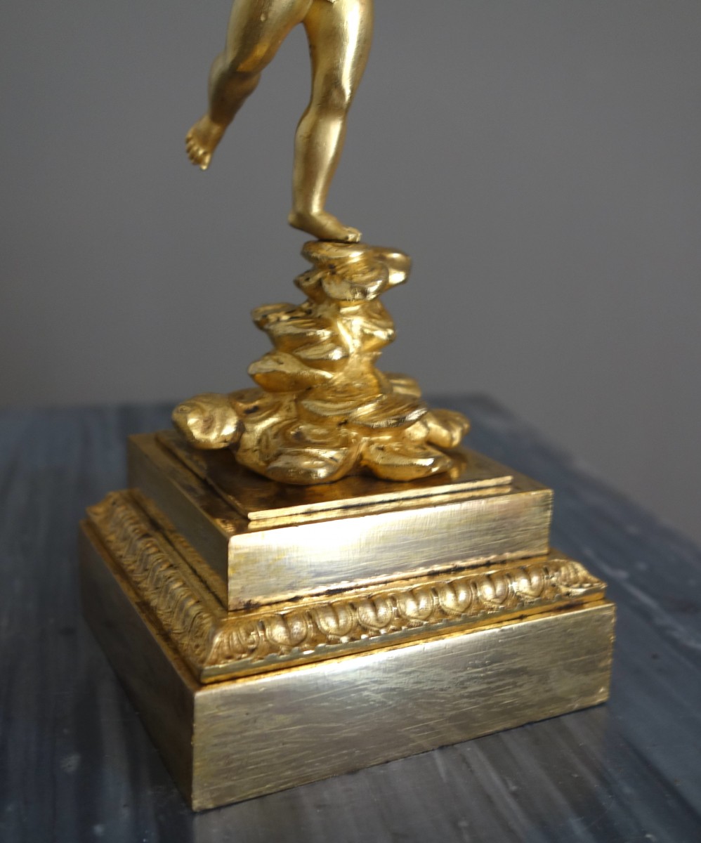 Statuette of Zephyr, god of the wind, in mercury-gilt bronze on a richly decorated base adorned with water-leaf motifs. Empire or Restoration period, early 19th century.