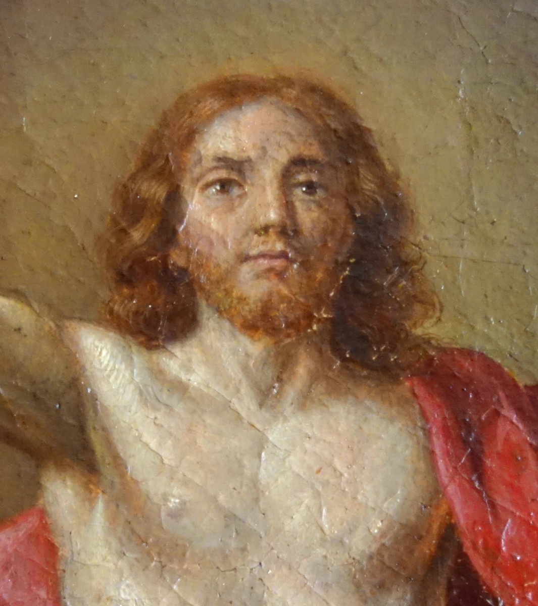 French School of the 19th century, The Resurrection of Christ after the original work by Annibale Carracci (1593) and the version by Carle van Loo (1734–38). The triumphant Christ emerges from his tomb opened by an angel. The Roman soldiers in armor are overcome by torpor. Painted in the direction of the original, the painting is executed in an almost nocturnal blue-gray tonality, as suggested by the biblical text. Christ stands out from the composition thanks to his pink drapery.