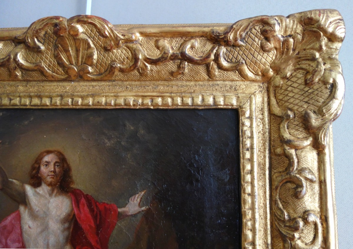 Our oil on canvas is presented in a very fine Louis XIV–Regence period frame from the early 18th century, in carved wood and gilded with gold leaf.