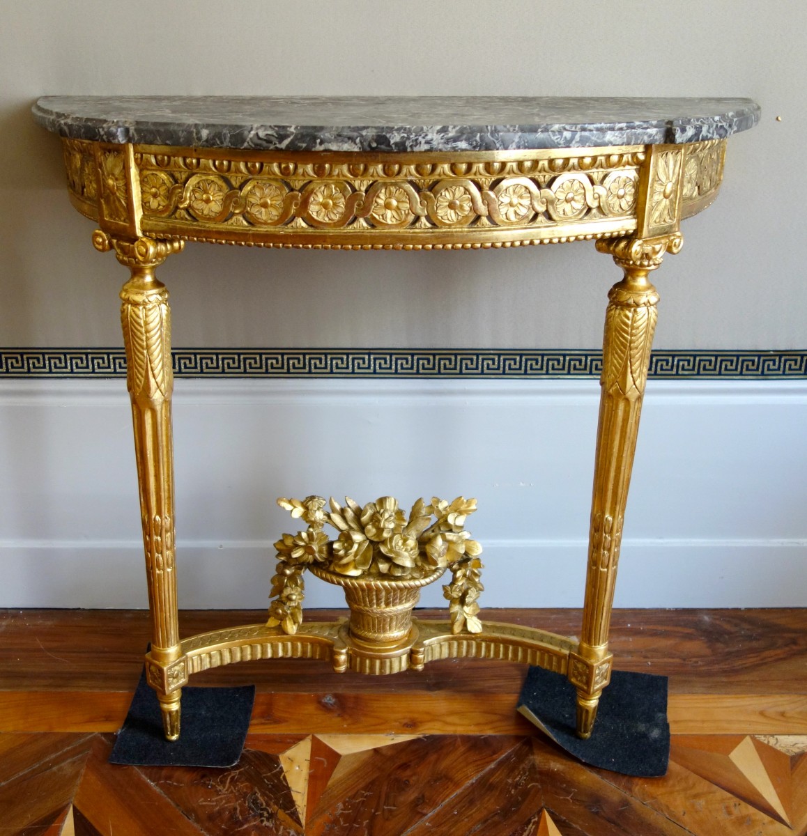 Beautiful giltwood console, richly carved, with fluted and reeded uprights ending in Ionic capitals and long acanthus leaves, the apron adorned with openwork rosettes, and a basket of flowers on the stretcher. Molded gray Sainte-Anne marble top. Provençal workmanship from the Louis XVI period, circa 1780.