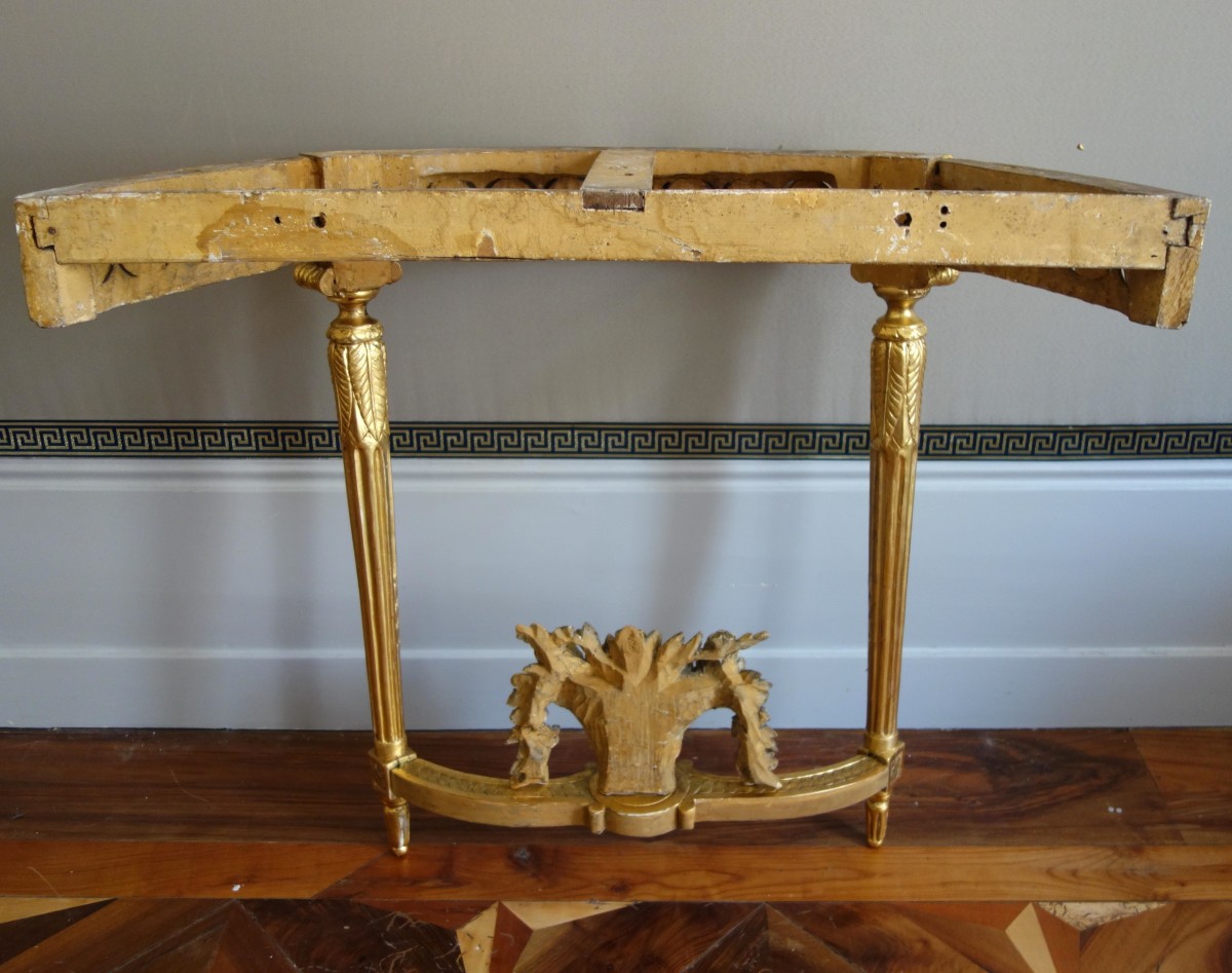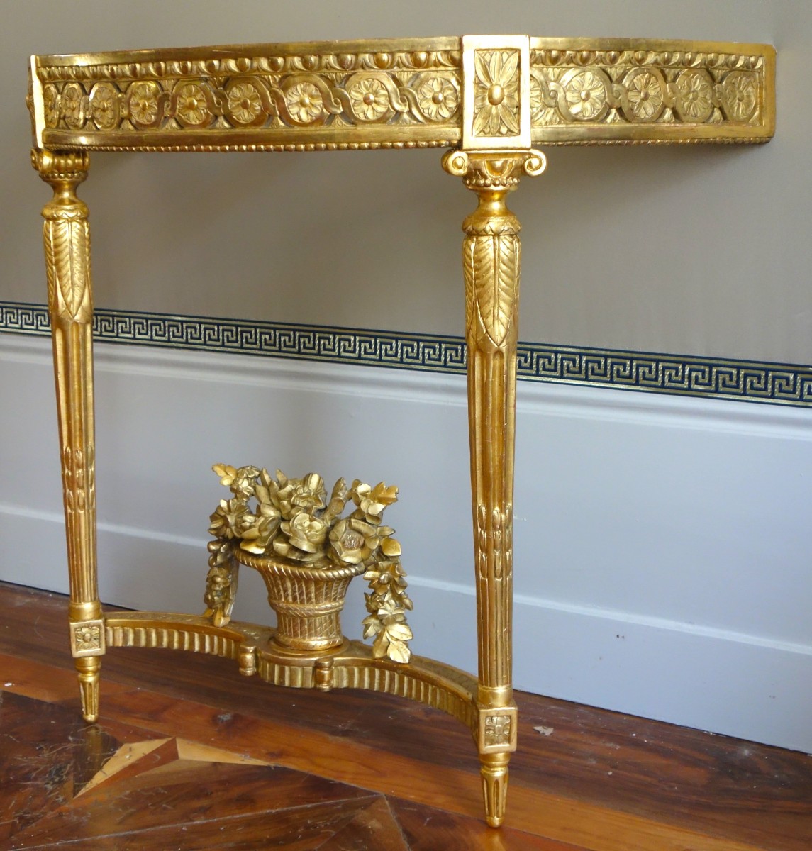 The model is rich and very carefully executed. The proportions are perfect and very elegant. Our console is a piece of superior quality. Very fine gold leaf gilding in both matte and burnished finishes.