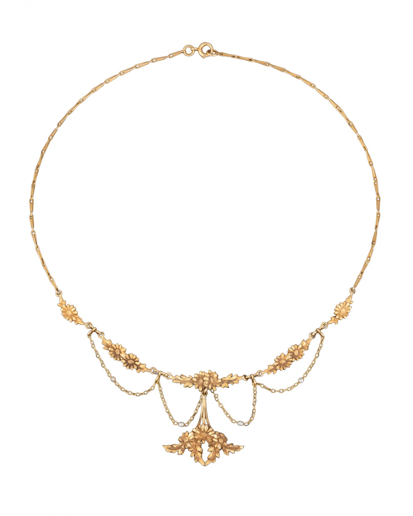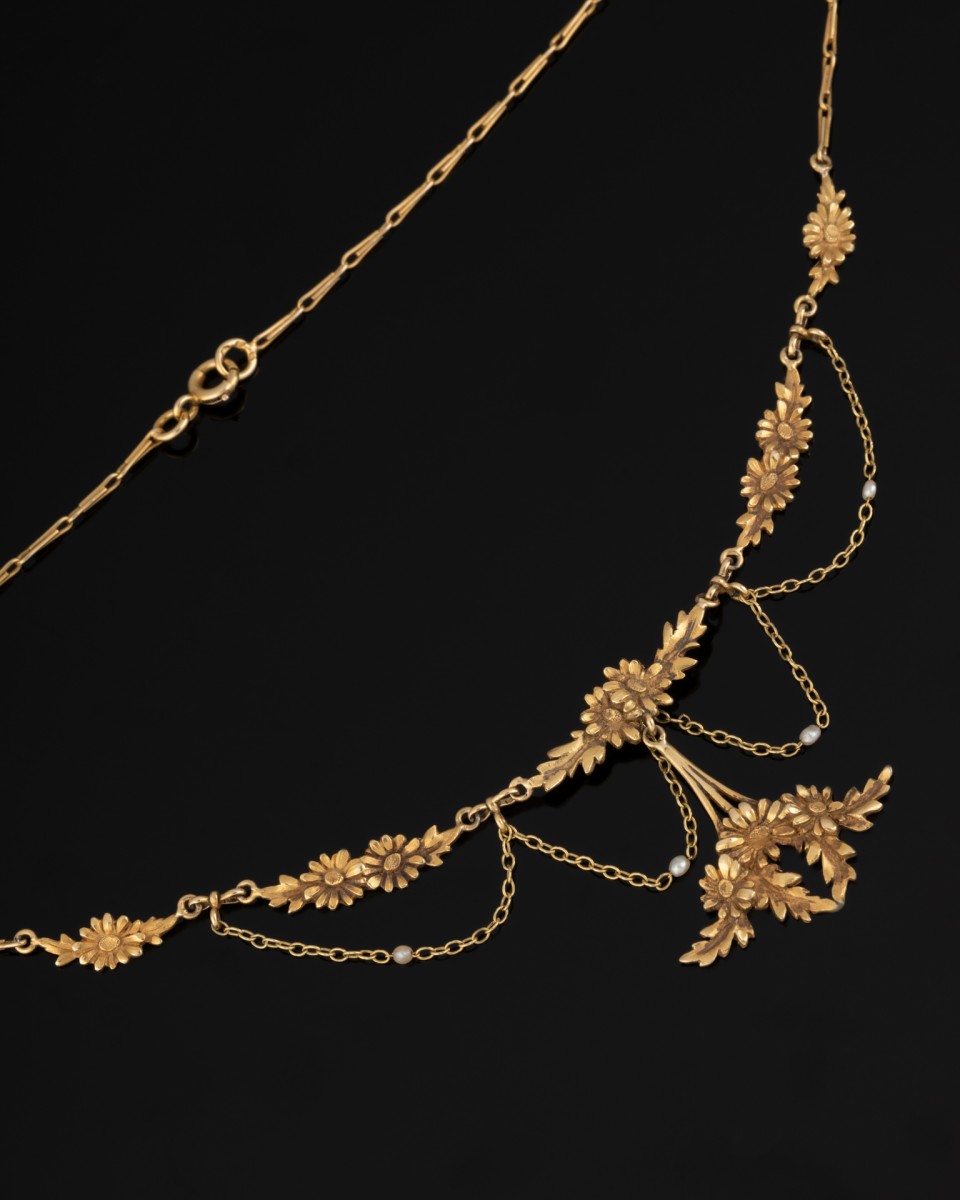 It features chased daisy motifs, interspersed with chains set with pearls.