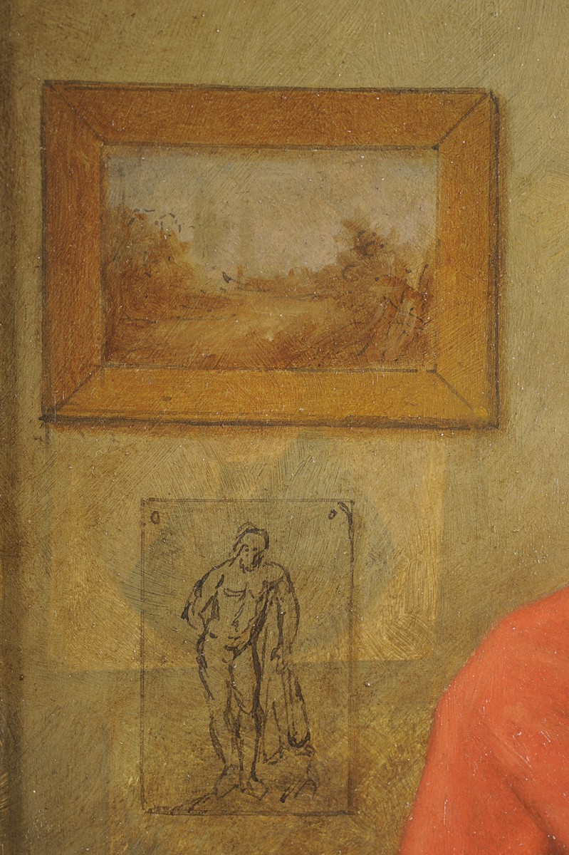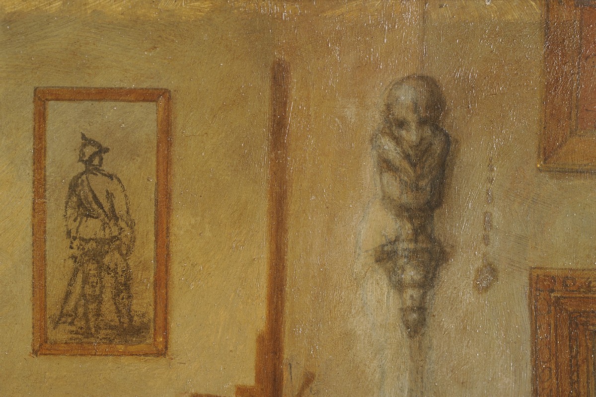 Our painting, executed at the very end of his life, has been almost entirely altered. Beneath the current layer of paint, we can clearly distinguish other paintings, drawings, and sculptures, positioned differently in the artist's studio. Their underlying silhouettes lend this highly commendable composition a sense of movement and the artist's spirit. Should we see in this portrait a self-portrait of the artist at a younger age?