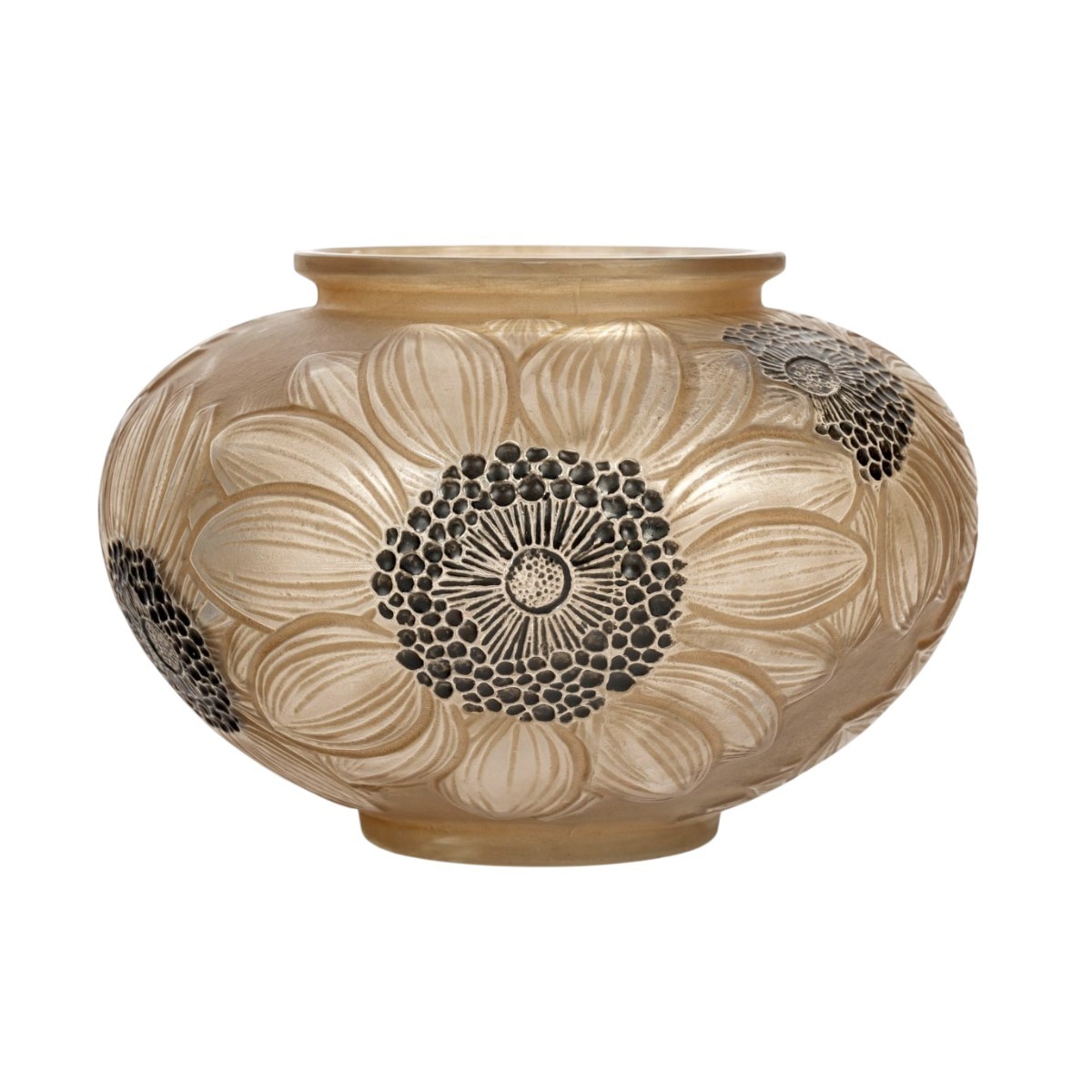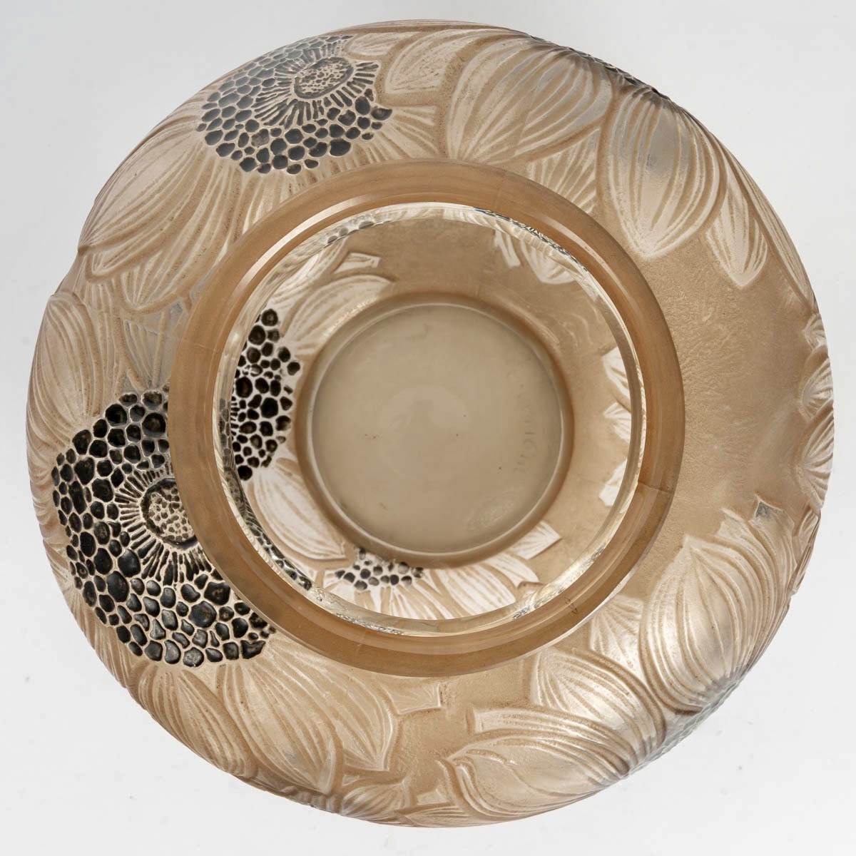 Vase "Dahlias" made in frosted glass with sepia patina and original black heated enamel by René Lalique in 1923.