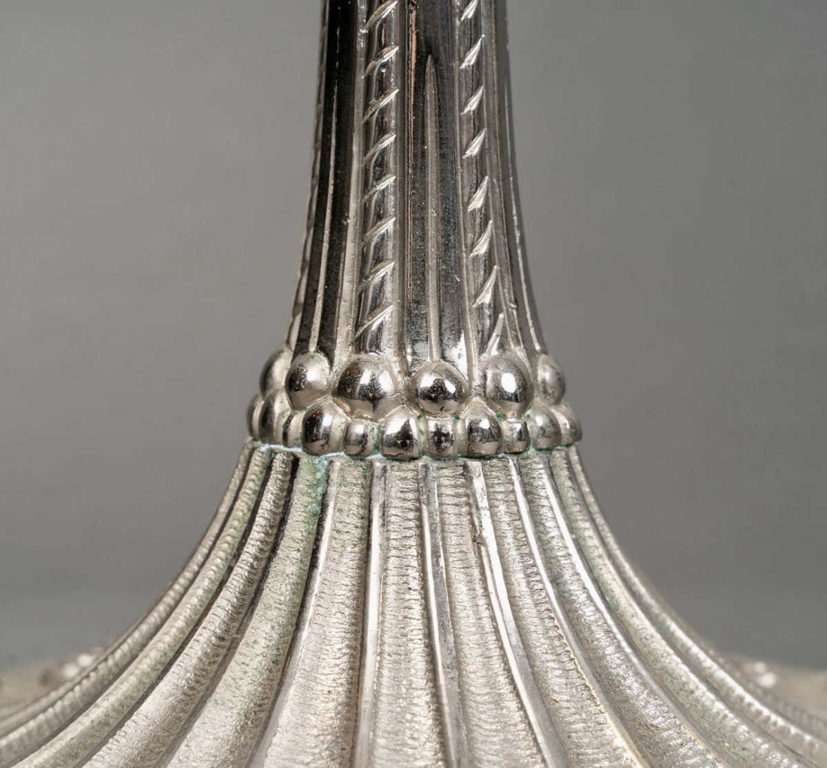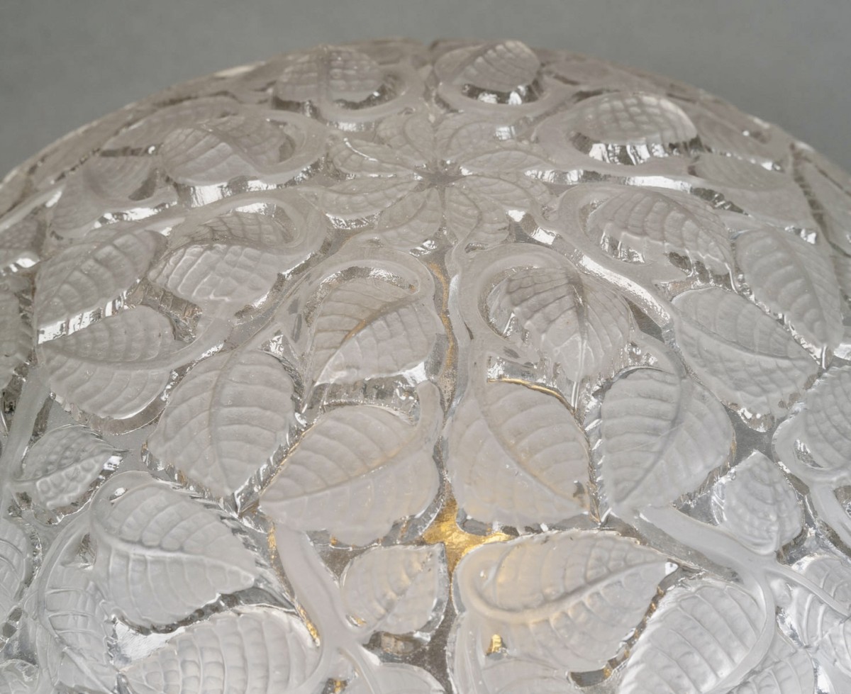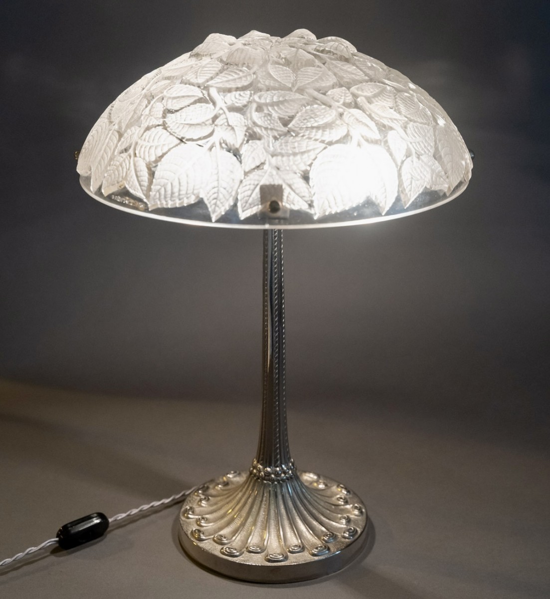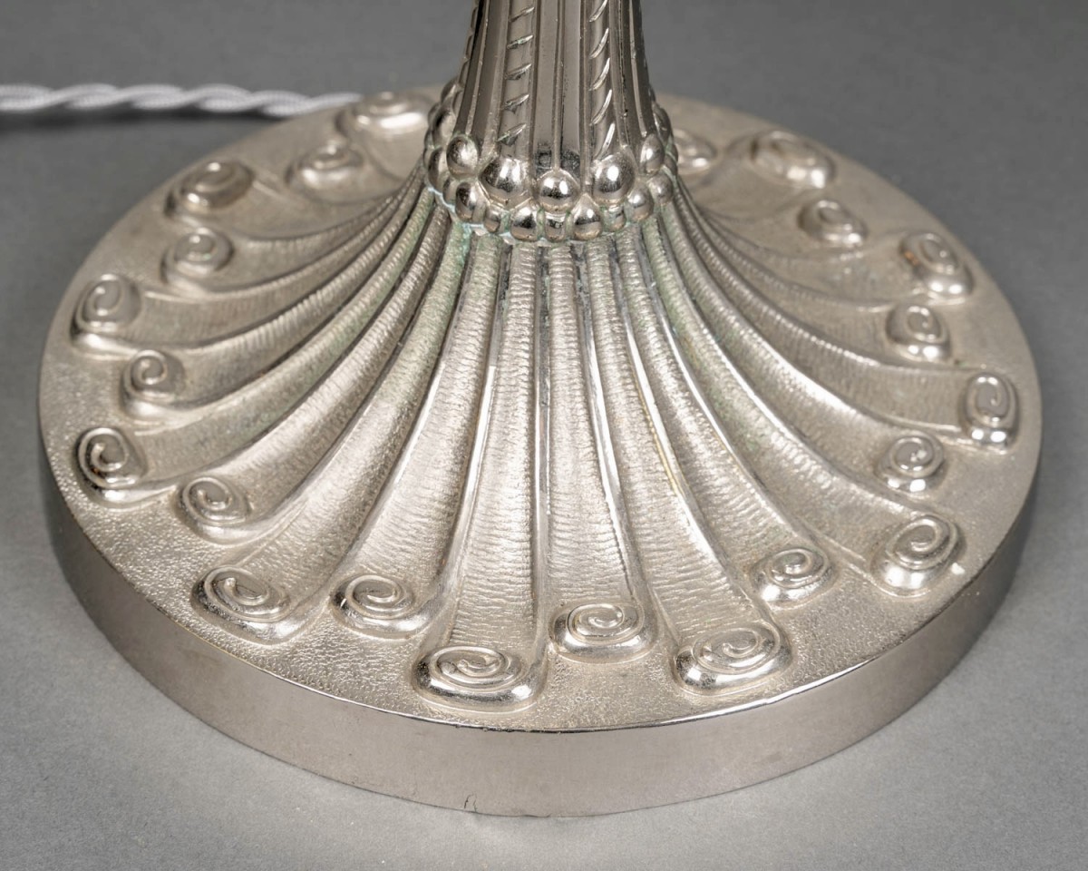 Lamp "Charmes" made in glass by René Lalique in 1924. Mounted on an Art-Deco foot in nickel-plated bronze.