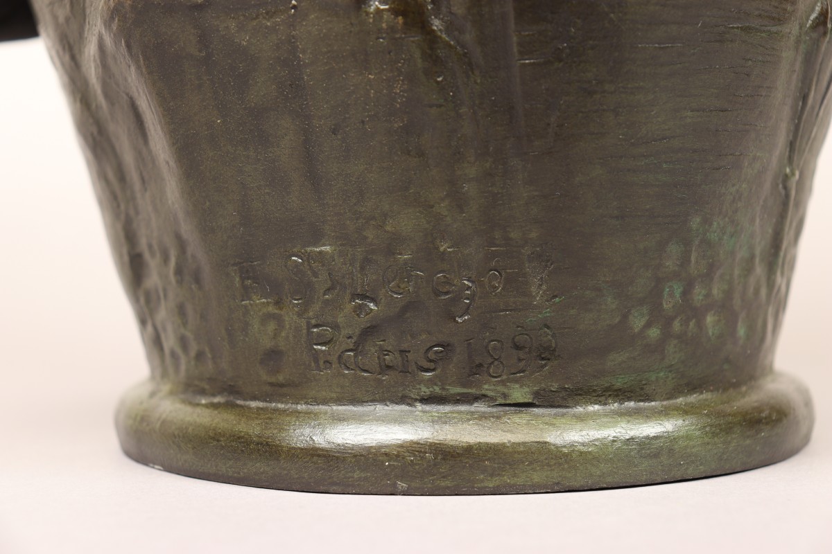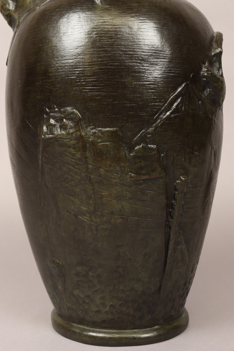 A major work by the artist, this large vase fully expresses the mysterious and captivating world of the fin-de-siècle spirit. Three bats, sovereign animals of the night with occult symbolism, emerge from the belly of the vase into a starry sky, delicately suggested by the hammering of the metal. The birds seem to fly over the rooftops of Paris, punctuated by telegraph wires, a subtle evocation of a modern city still traversed by shadow and silence. Hans Stoltenberg-Lerche delivers an emblematic work here, in which a fascination with wild and untamed nature confronts the dizzying heights of nascent modernity. This vase stands out as one of the most accomplished expressions of Symbolist Art Nouveau, straddling the line between art object and sculpture.