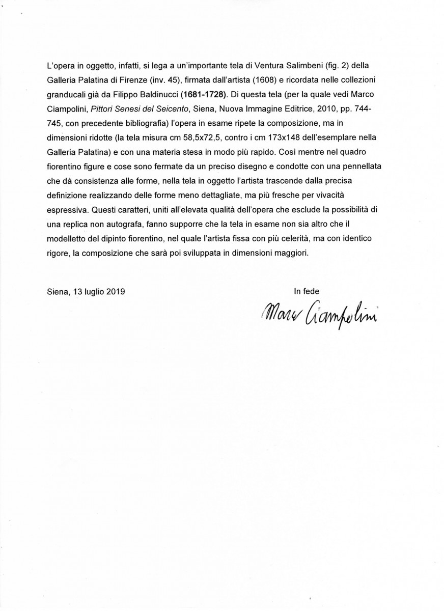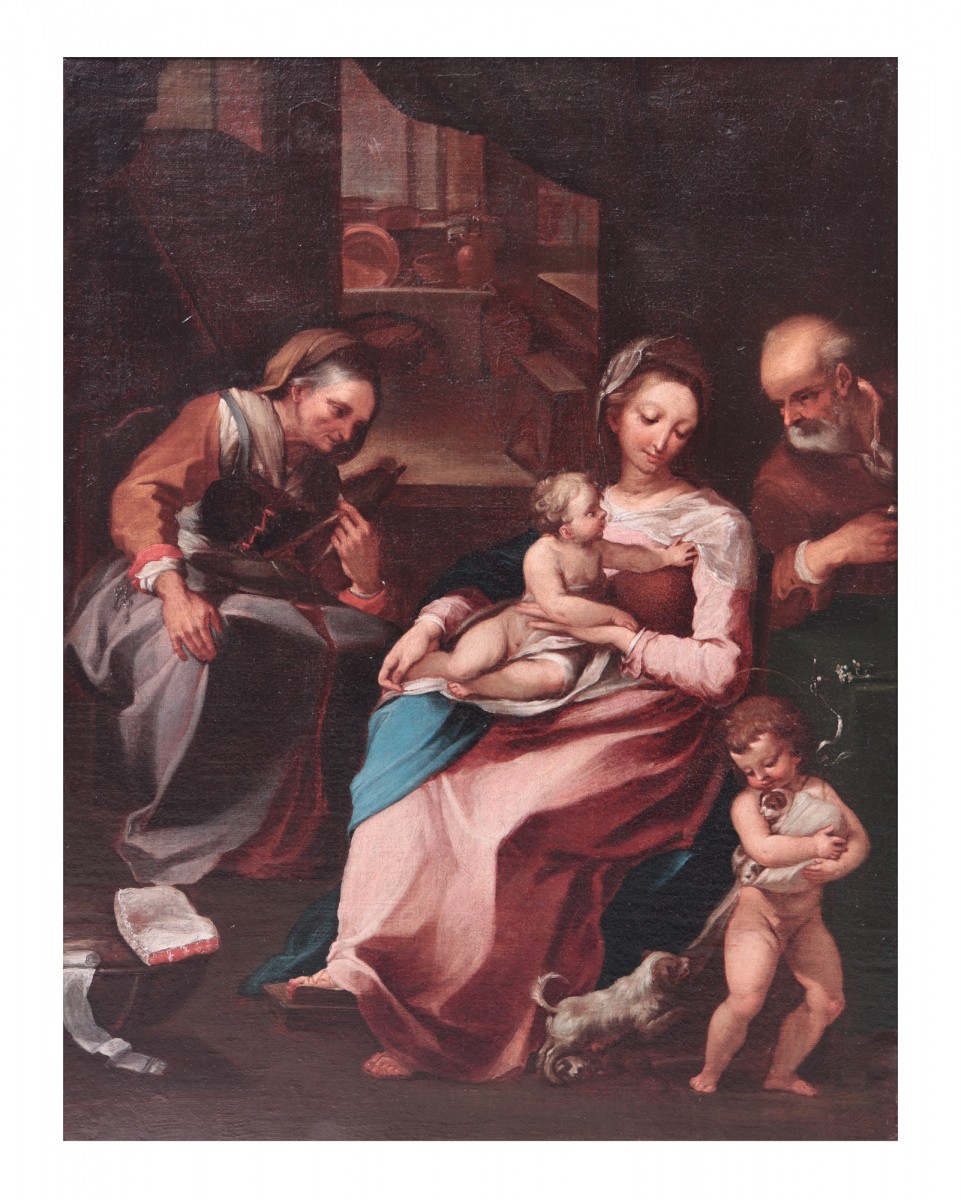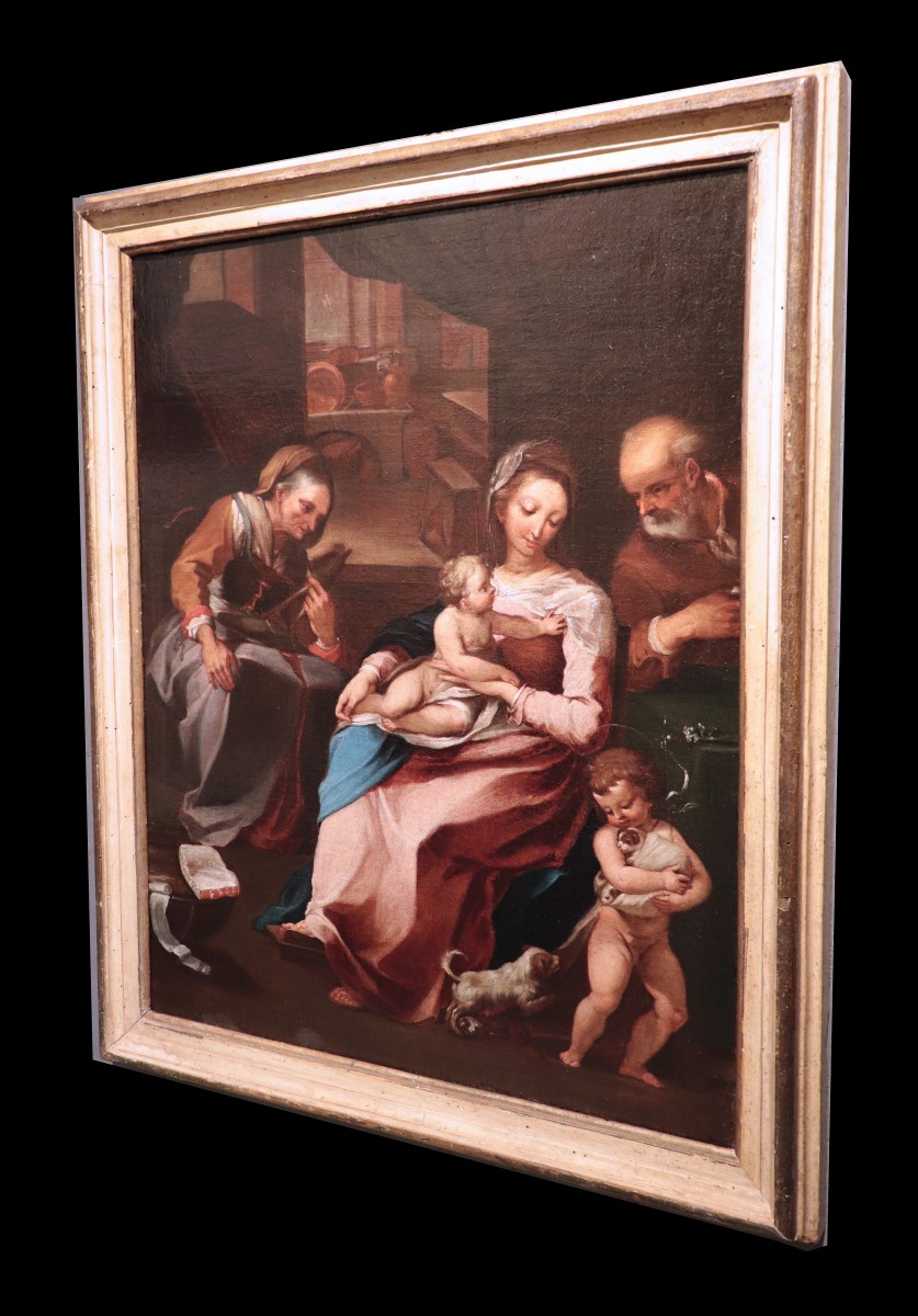 Ventura Salimbeni (Siena, 1568-1613) - Family Scene of the Sacred Holy Family of St. Elizabeth and St. John the Baptist Oil painting on canvas with non-contemporary antique frame Expertise: Prof. Marco Ciampolini Size of the canvas: 58.5x72.5cm This painting was realized by Salimbeni Ventura as a small presentation to the client of the large canvas then understood that it is currently in the gallery Palatina in Florence of Palazzo Pitti. A painter among the last representatives of the Sienese Mannerist School, he attended a training session at his father's studio in Siena and then moved to Rome in 1588, where he worked for clients such as Pope Sixtus V and Cardinal Aldobrandini. the Vatican Library and the Gesù Church. Returning to Siena in 1595, he worked on many pictorial cycles, including scenes from the life of San Giacinto in Santo Spirito (1600). His fame earned him commissions in many Tuscan centers for the frescoed decoration of churches, among which the San Lorenzo paintings in San Pietro in Montalcino are distinguished by the richness of the colors and the majesty of the scenographic installation. baroque origin. (Dispute of the Eucharist, 1600) and in the Duomo of Siena (Fall of Manna, 1608).