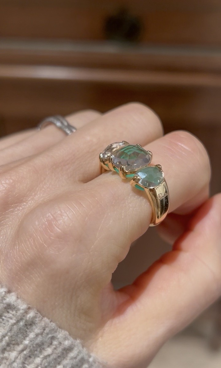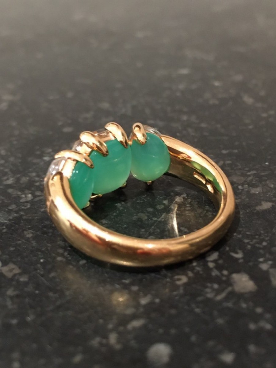 It is made of 18K yellow gold and set with three faceted rock crystals on the front and three cabochon chrysoprase on the back.