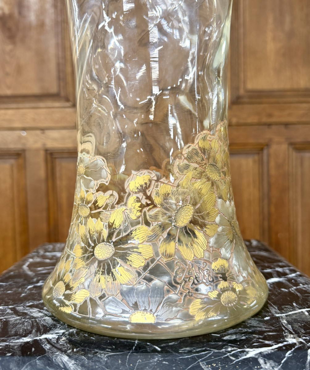 Rare flared vase in enameled glass finished with a multi-lobed neck. This vase is slightly twisted with hot glass stretching, giving a slight wave effect in relief. Rich enamel decoration, acid-etched and gilded with daisies, chrysanthemums, and spider webs. Signed “Gallé” with a plant-inspired font in the lower part on a web background. In perfect condition for an Art Nouveau piece.