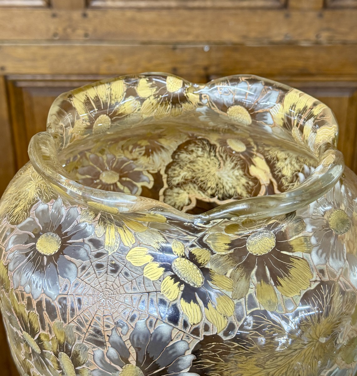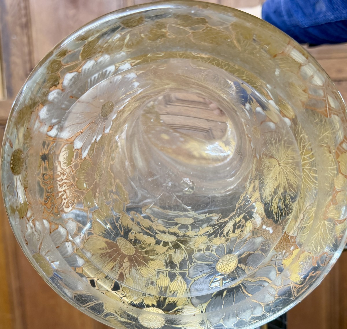 A rare vase that can be dated to around 1895, the period known as “Cristallerie” during which Emile Gallé developed models of different shapes in enameled glass. In the Art Nouveau rooms of the Petit Palais, we find a model entitled “chrysanthemum flowers,” dated 1895, whose gold and acid-etched decoration is similar to that of our vase (inventory number: OGAL596).