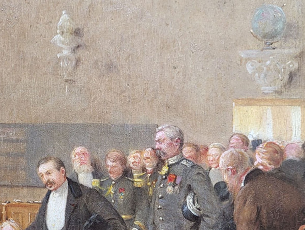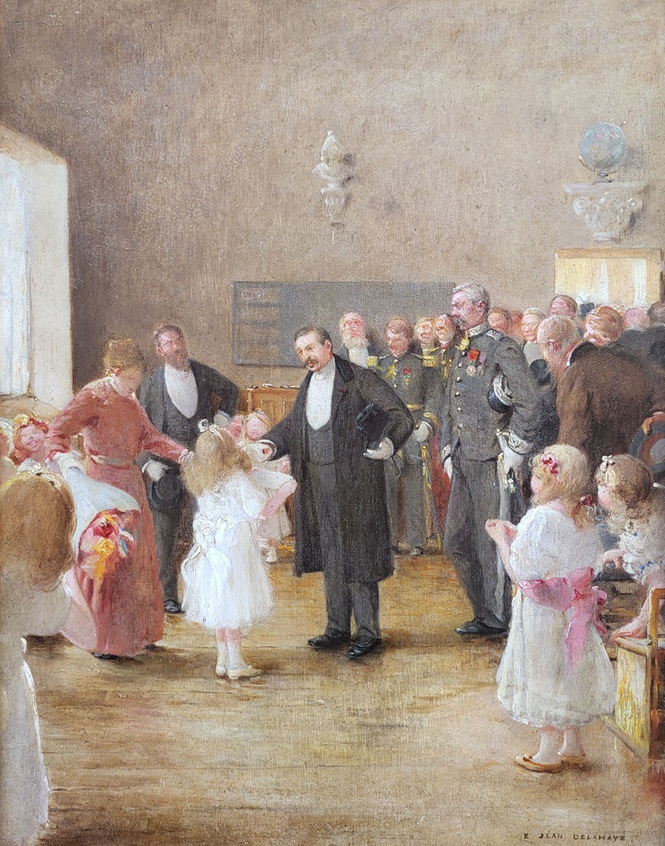 Our painting of the visit of Minister of War Bertaux (1852-1911), by Ernest Jean Delahaye, depicts an official scene taking place in a school hall or municipal venue.