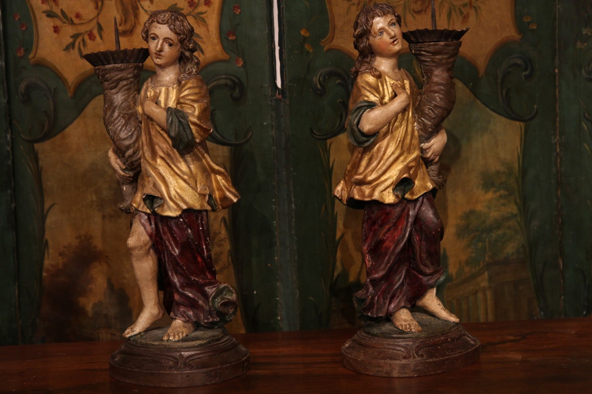 Pair of gilded and polychrome carved wood torchbearer angels. They hold a cornucopia with one hand, and the other hand is resting on their chest. Their youthful faces, with fine features, are covered with abundant hair. The ample clothing is as if animated by a breath in the spirit of the Baroque style.