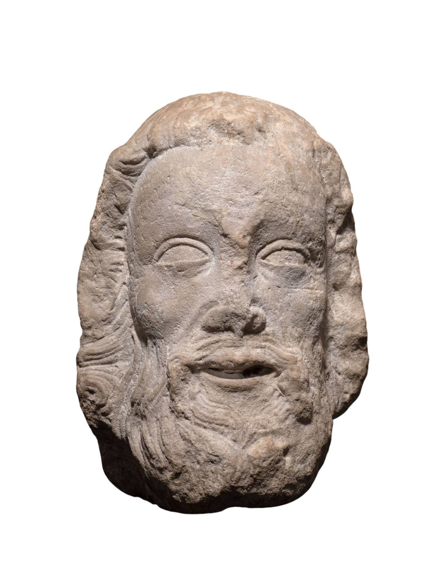 The hair, carved in spiral waves, falls over the ears down to the nape of the neck. The mustache and beard, with S-shaped strands, frame a slightly open mouth, the lips drawn back in a subtle smile.