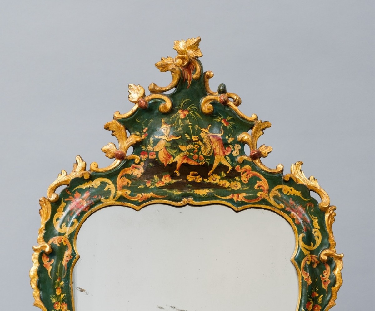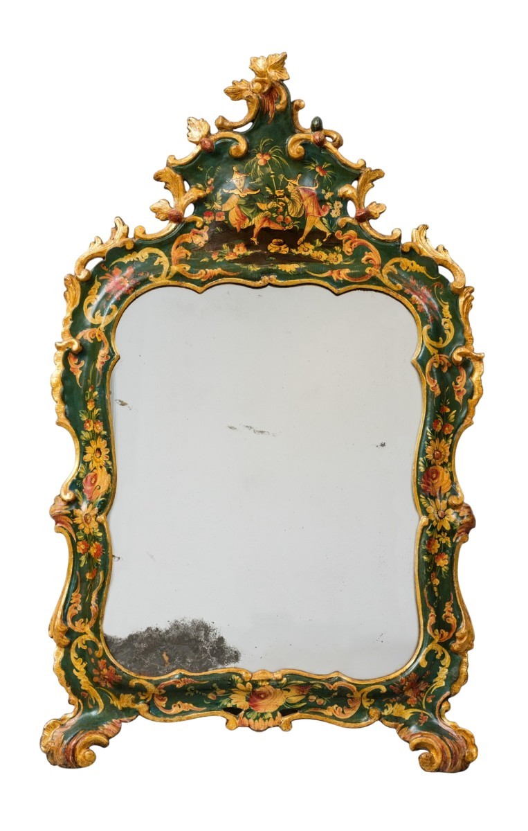 Venetian mirror in lacquered and gilded wood, decorated with chinoiserie. Mid-18th century.