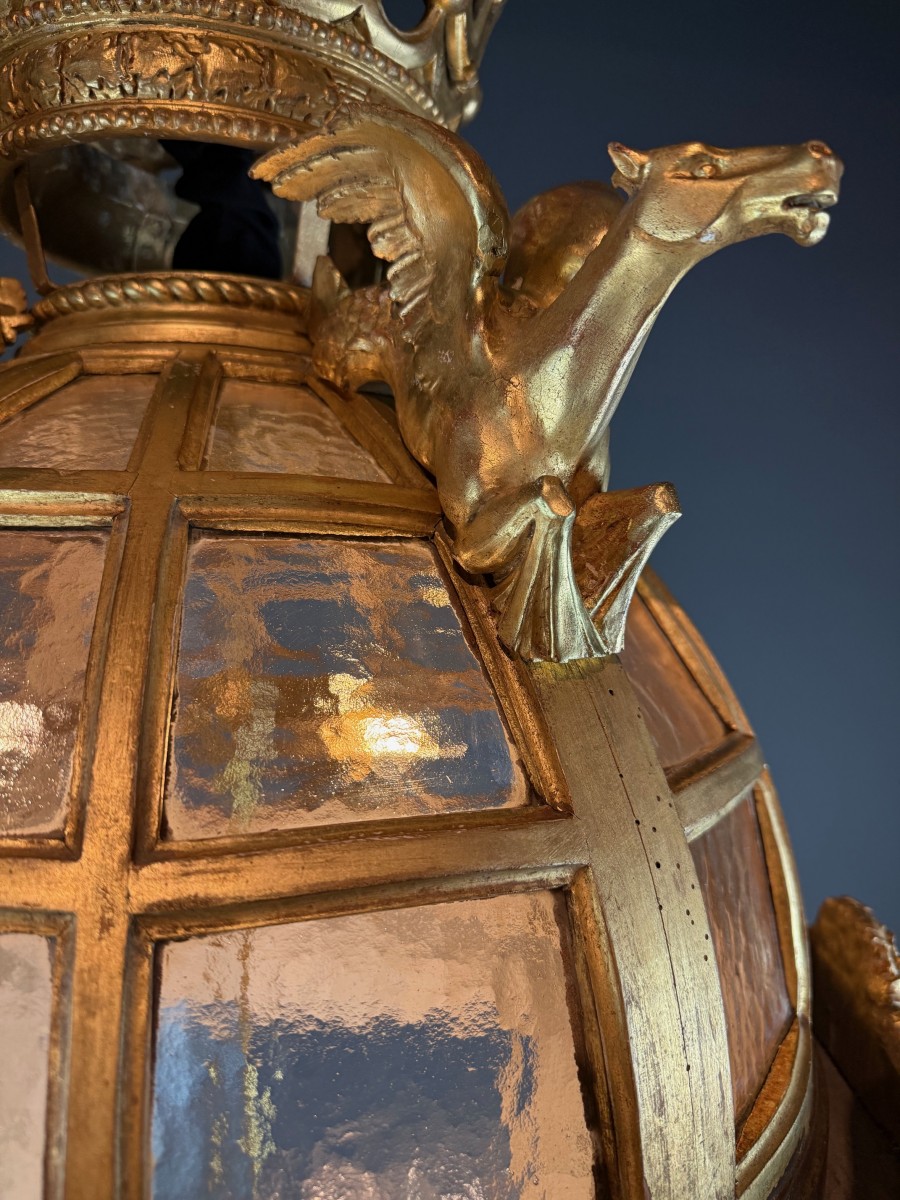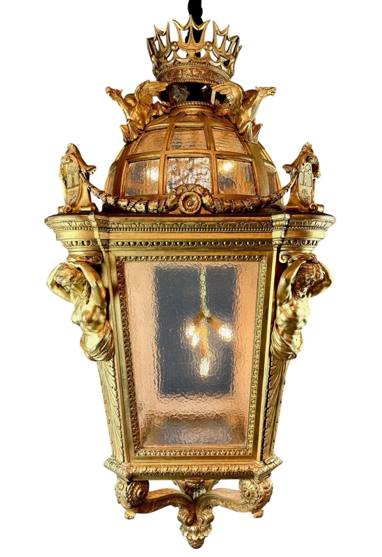 Exceptional monumental giltwood dome lantern from Italy, late 19th century, retaining its original gilding. This striking piece features sculptural male and female caryatids, hand-textured glass panels, and a richly detailed domed crown adorned with 4 Pegasi.