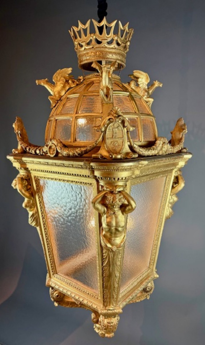 A Large Monumental Lantern In Gilded Wood - Italy Late 19th Century. H170cm - Lighting Style Napoléon III A Large Monumental Lantern In Gilded Wood - Italy Late 19th Century. H170cm - A Large Monumental Lantern In Gilded Wood - Italy Late 19th Century. H170cm - Napoléon III Antiquités - A Large Monumental Lantern In Gilded Wood - Italy Late 19th Century. H170cm