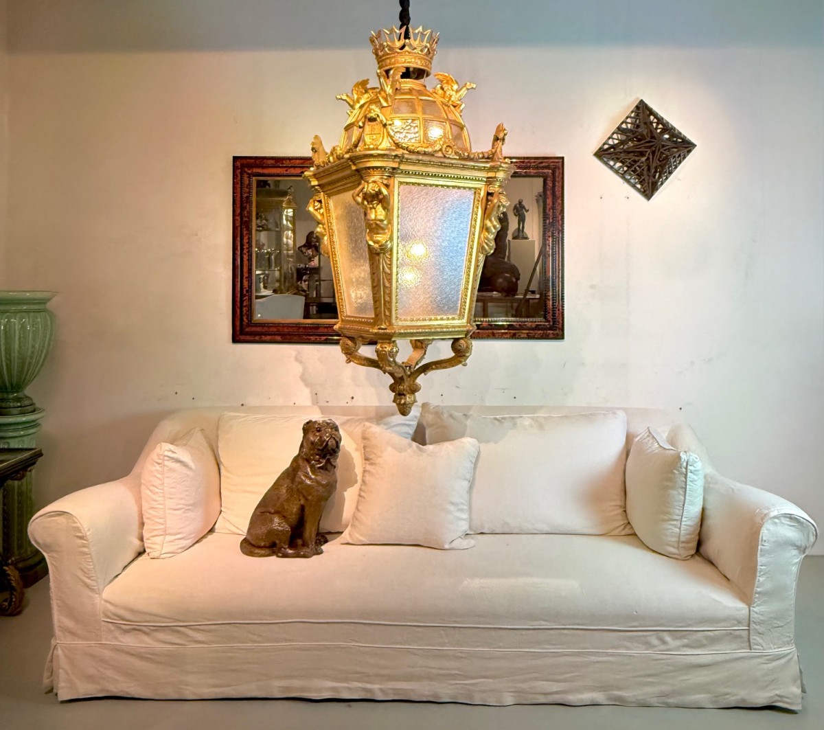 Professionally fitted with seven light points, offering generous illumination while preserving its historic character. A rare and highly decorative architectural lantern of outstanding craftsmanship.