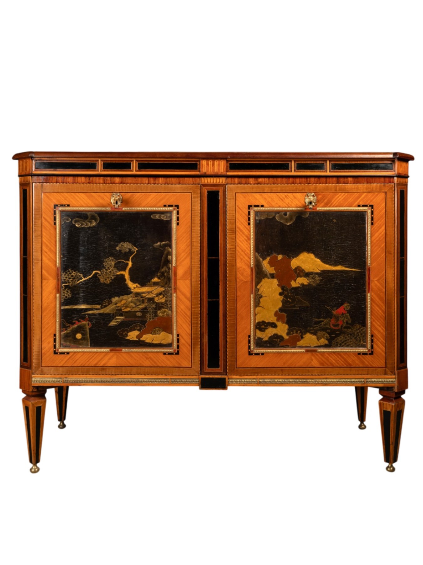 The commode is adorned on the front and sides with four large Chinese lacquer panels depicting lakeside landscapes and figures in traditional dress.