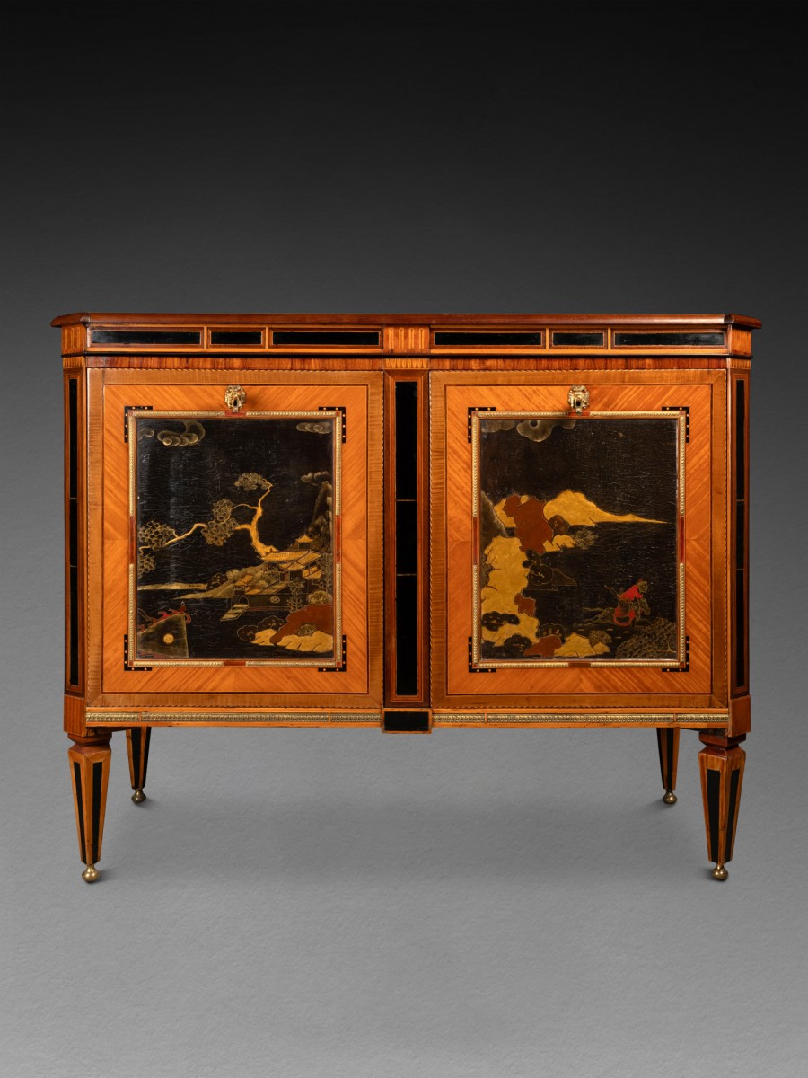 With its precious woods and lacquer panels, it imitates the French furniture that dominated European fashion at the end of the 18th century; but its changing mechanism is directly derived from the commodes found on ships of the Dutch East India Company.