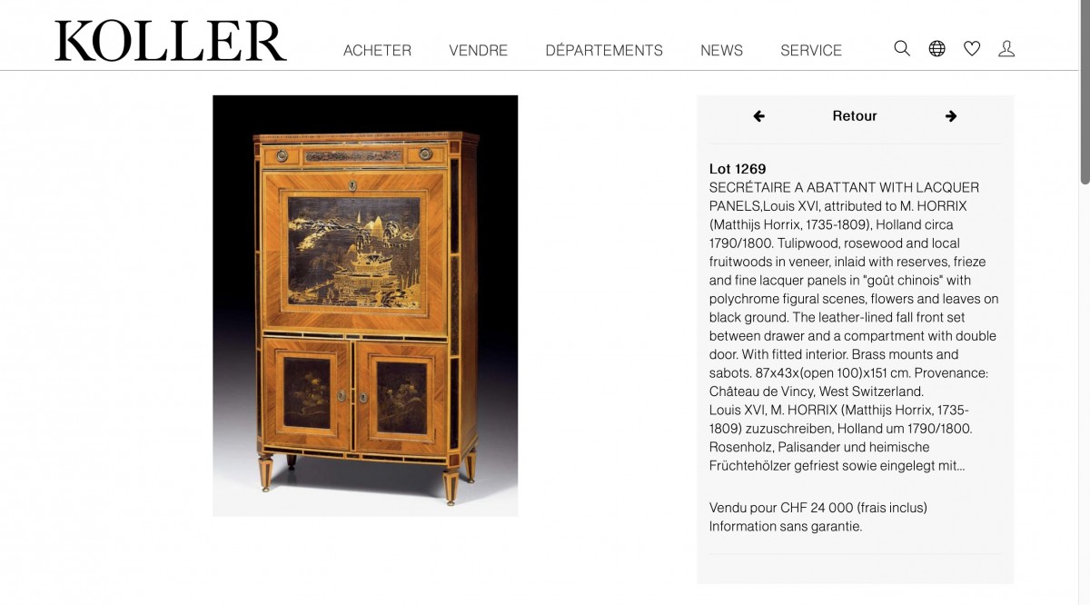- The secretary desk, probably part of a suite with our commode and originating from Vincy Castle in Switzerland, was sold at Koller Zurich on Thursday, March 22, 2007, lot 1269 (CHF 24,000)