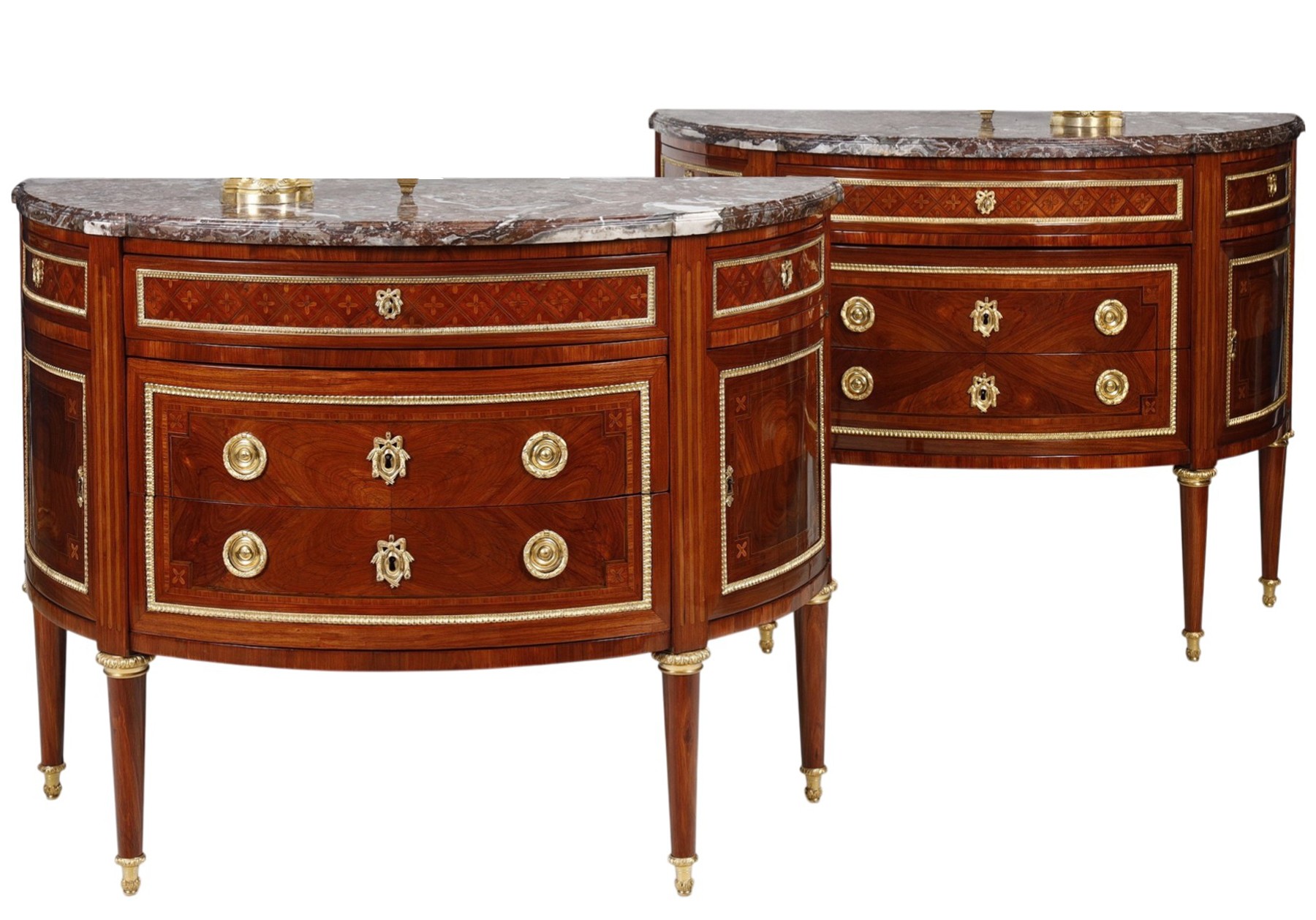 The two commodes are stamped three times on one and twice on the other with the mark F SCHEY, for Fidelys Schey, a master craftsman admitted in 1777, as well as the stamp JME (Guarantee of Cabinetmakers), attesting to their conformity with the guild practices of the Ancien Régime.