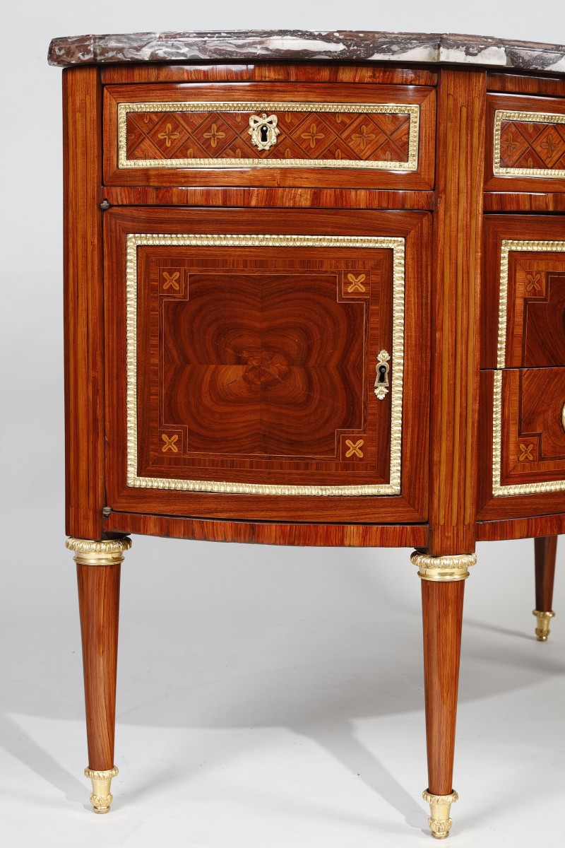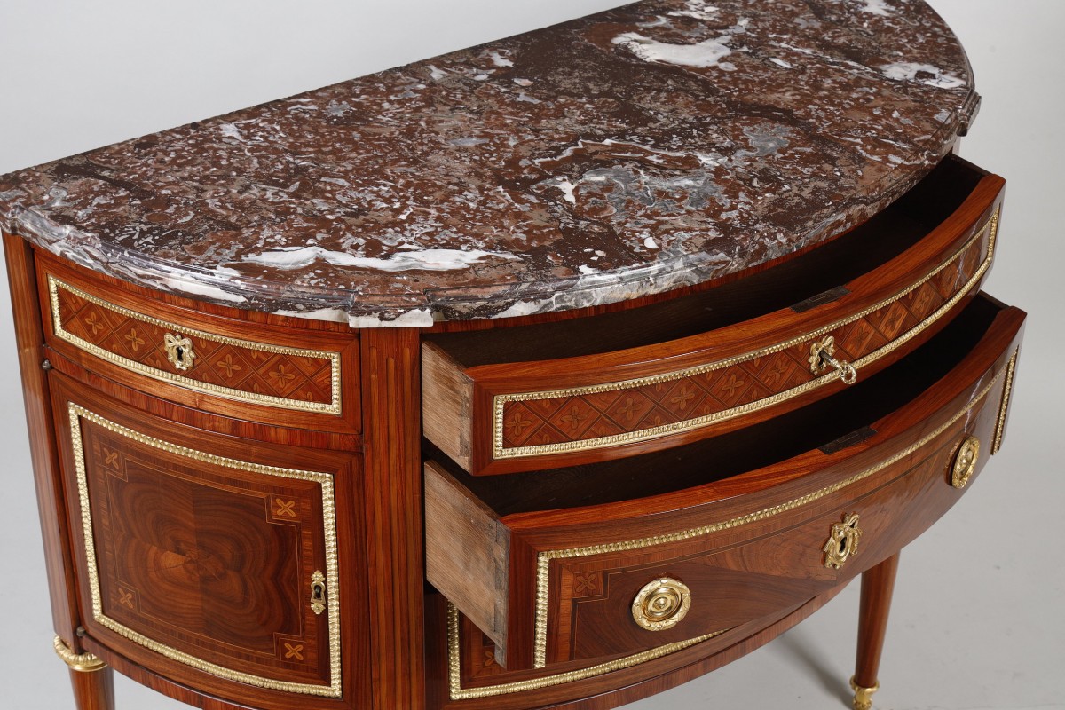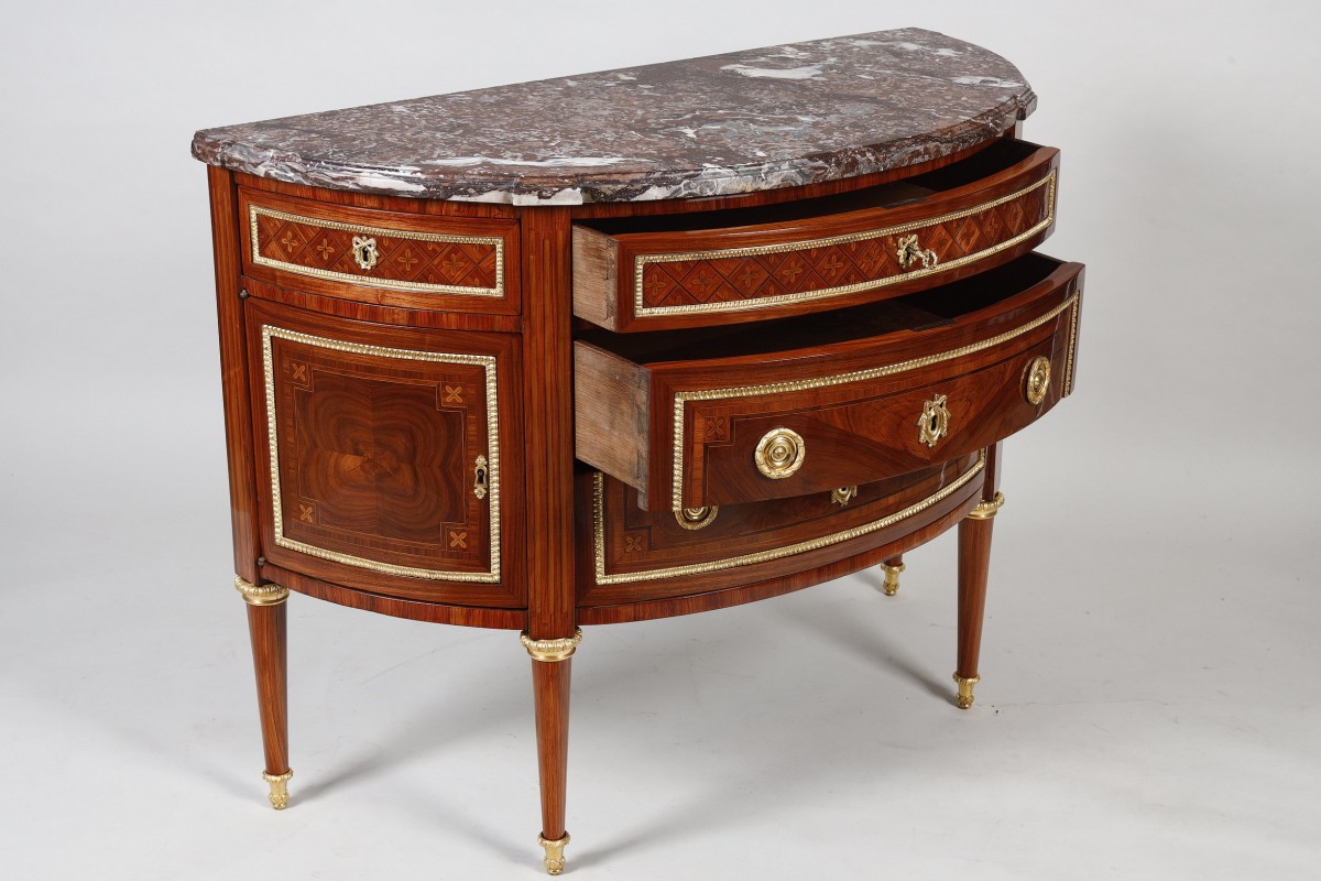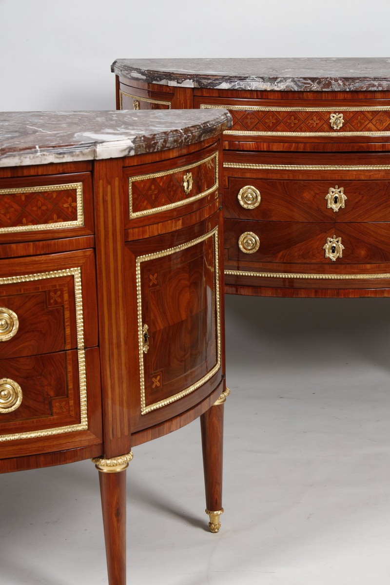 A very elegant and rare pair of Louis XVI half-moon commodes, crafted in marquetry and wood veneer, each opening at the front with five drawers, two without a central rail and three in the frieze, as well as two side doors revealing a shelf.