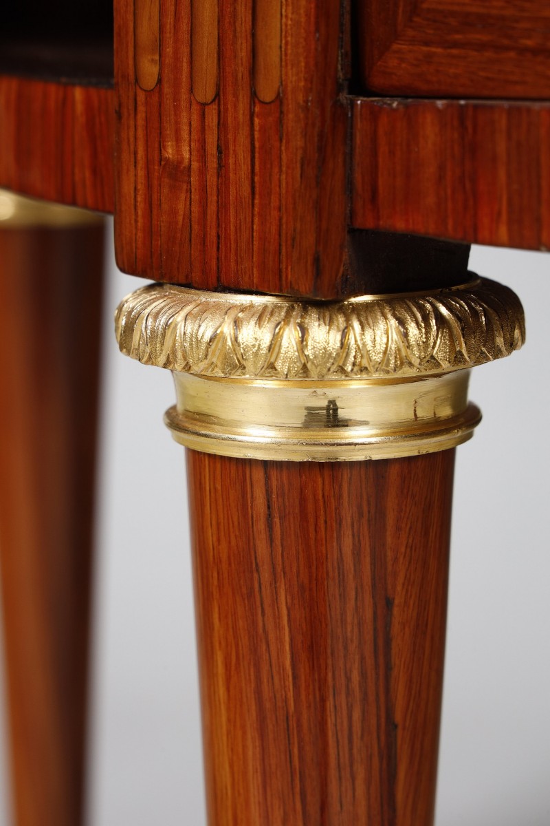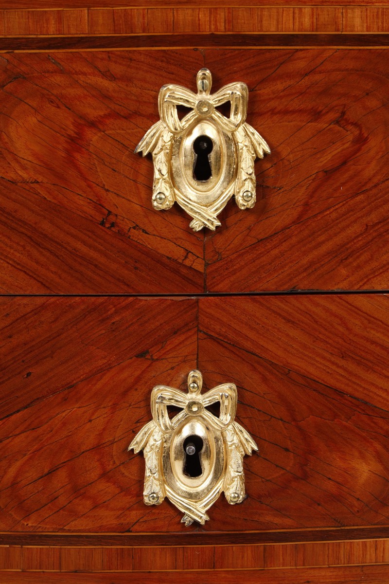 The frieze drawers are decorated with a lozenge frieze centered with a stylized four-petaled flower, framed by gilt-bronze fillets in a heart-shaped pattern. The keyhole escutcheons have similar motifs to those of the two large drawers, with medallions surmounted by laurel wreath knots, while the door keyhole escutcheons are simpler, with beaded acanthus leaves. The ring and feet are finely chased. The uprights are fluted.