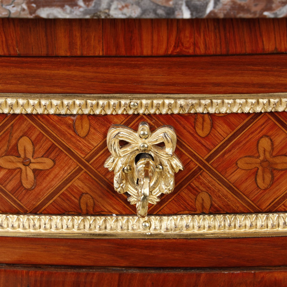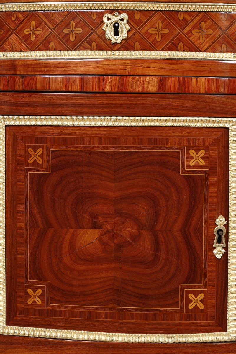 The fronts and side doors feature exquisite marquetry in a veneer pattern, showcasing a finely chosen veneer, adorned in each corner with a four-petaled marquetry flower framed by gilt-bronze fillets in a heart-shaped motif.