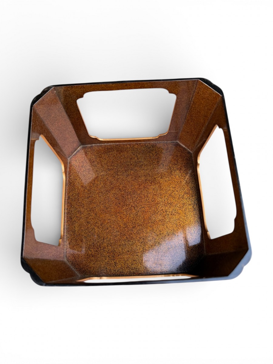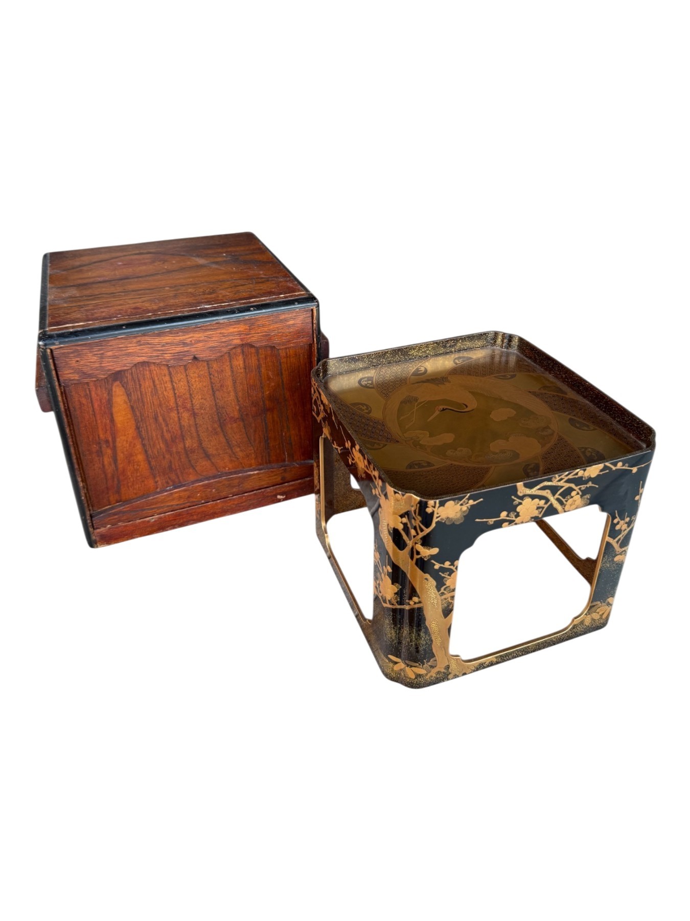 This small, square lacquer stand is a ceremonial or decorative tea utensil known as a kazaridana or tsuridana, typically used during Japanese tea ceremonies (chanoyu). Its compact, open-sided form suggests usage in the summer tea season (furo) to display incense boxes, tea caddies, or other valued objects. The stand is finished in black lacquer with exceptional gold maki-e decoration and a polished nashiji interior.
