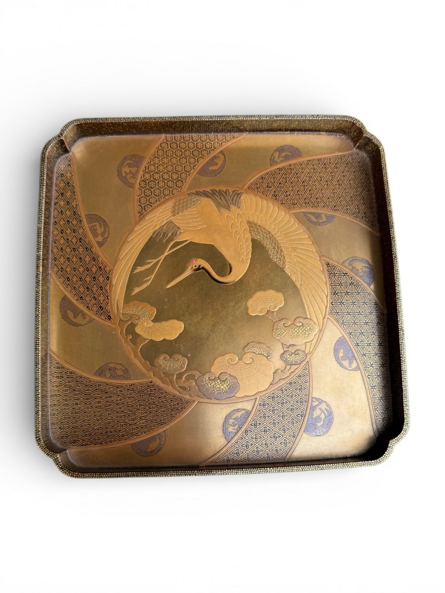 The top features an exquisite crane motif surrounded by clouds and radial geometric panels, symbolizing longevity and harmony. The side panels showcase delicate scenes of flowering plum branches and bamboo foliage, all rendered in finely detailed gold and silver lacquer work.