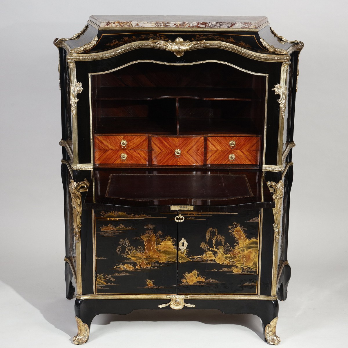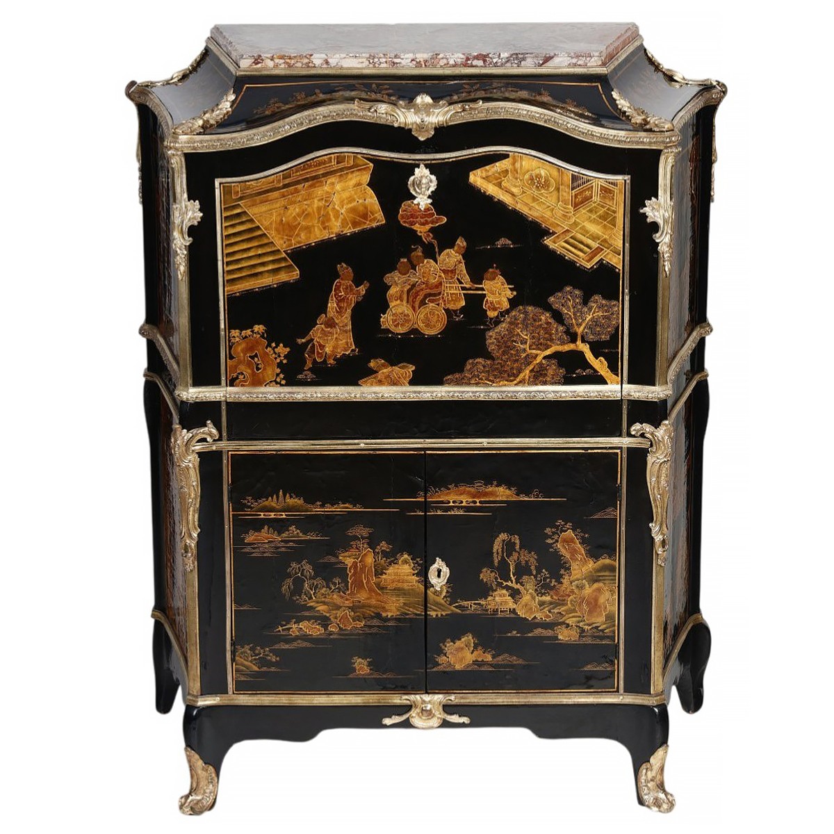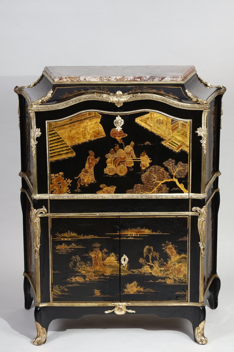 The drop-front and the two front doors are covered in black, gold, and brown Chinese lacquer, as are the sides, each decorated with two large panels of the same lacquer.