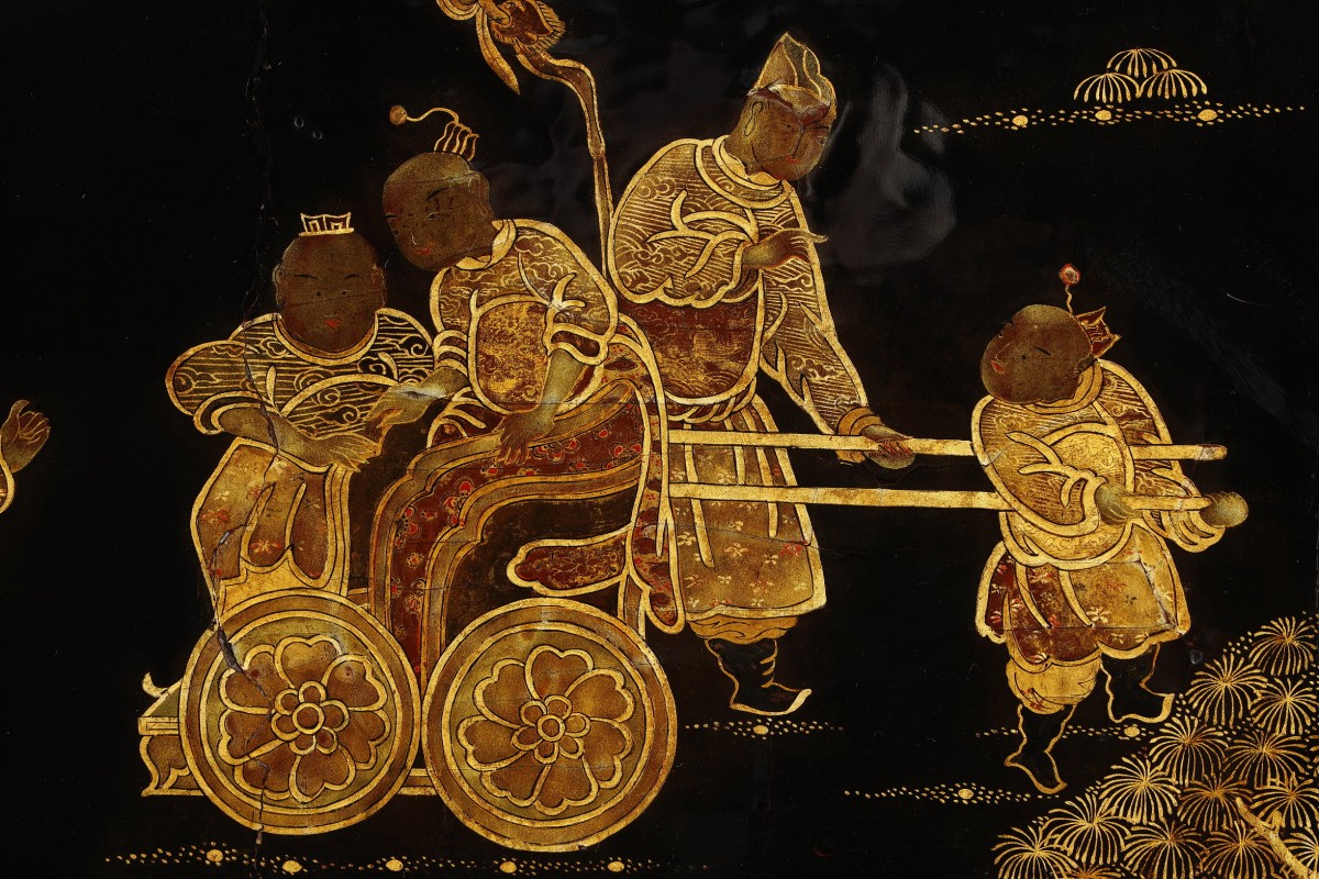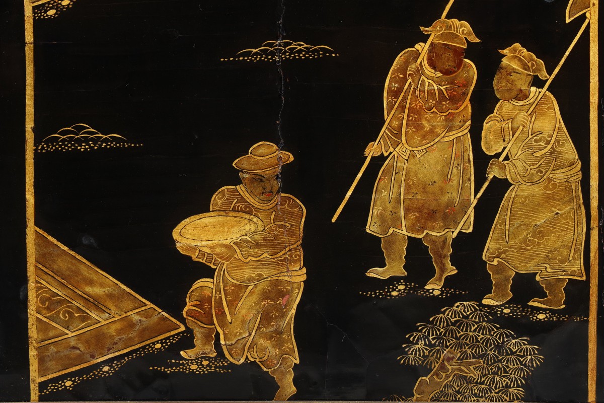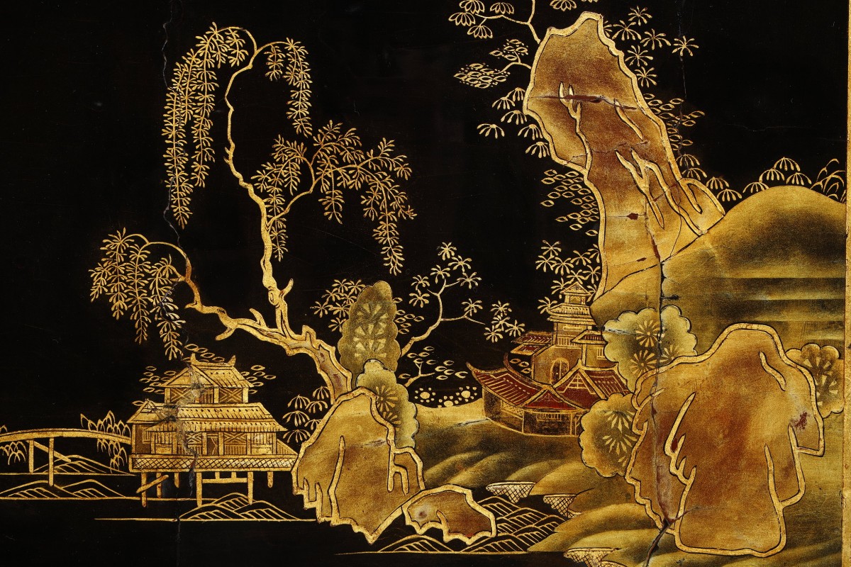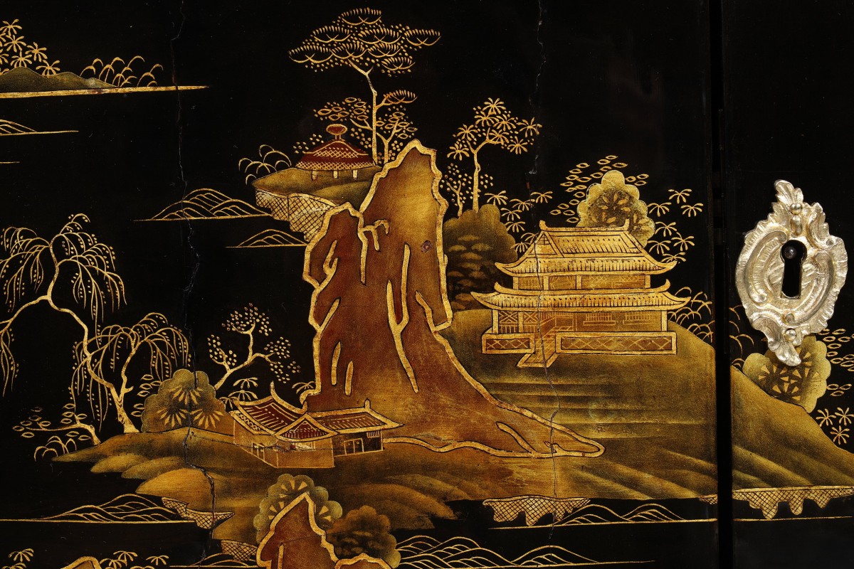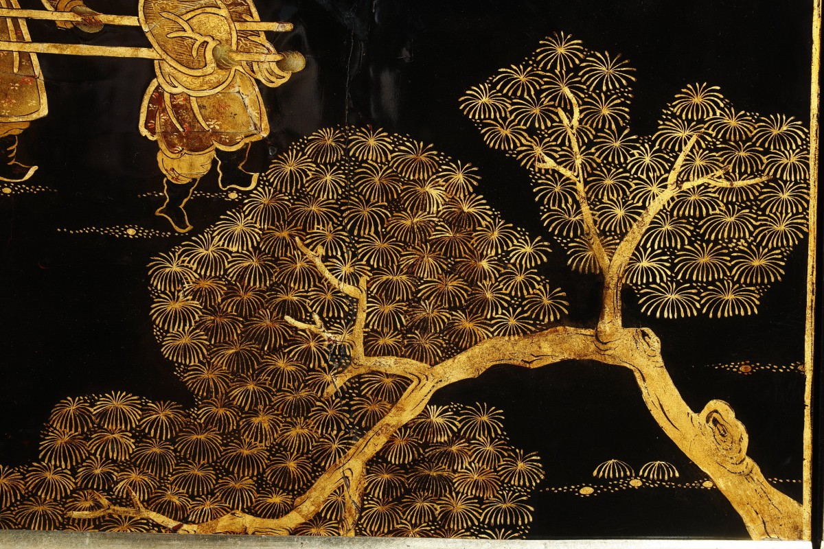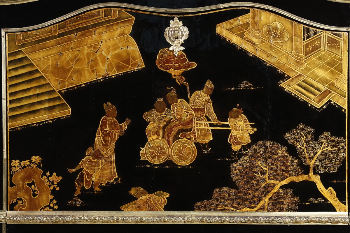 The lacquer panels on the two lower doors depict inhabited islands and a bridge connecting them.