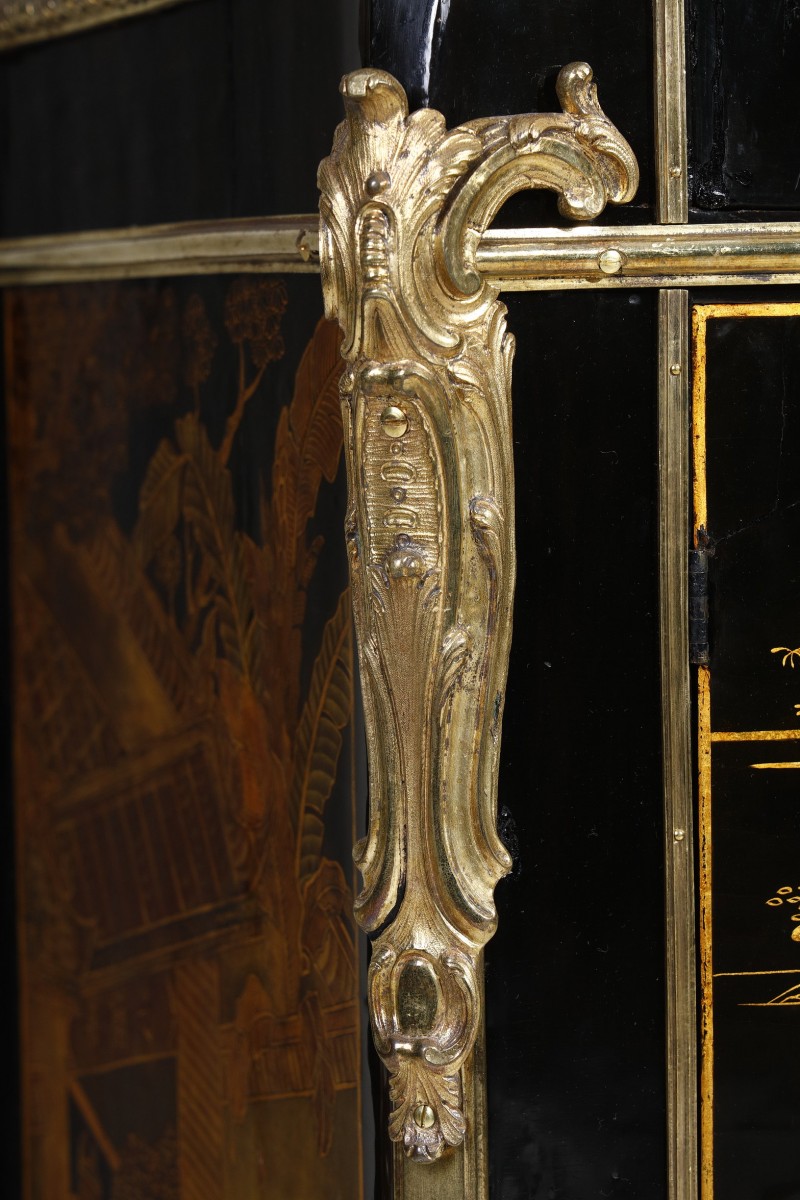 Some of the original bronze mounts, such as the astragal, reserve and frame fillets, and drops from the front uprights decorated with lacquered foliage, are present; other parts have been replaced or are missing.