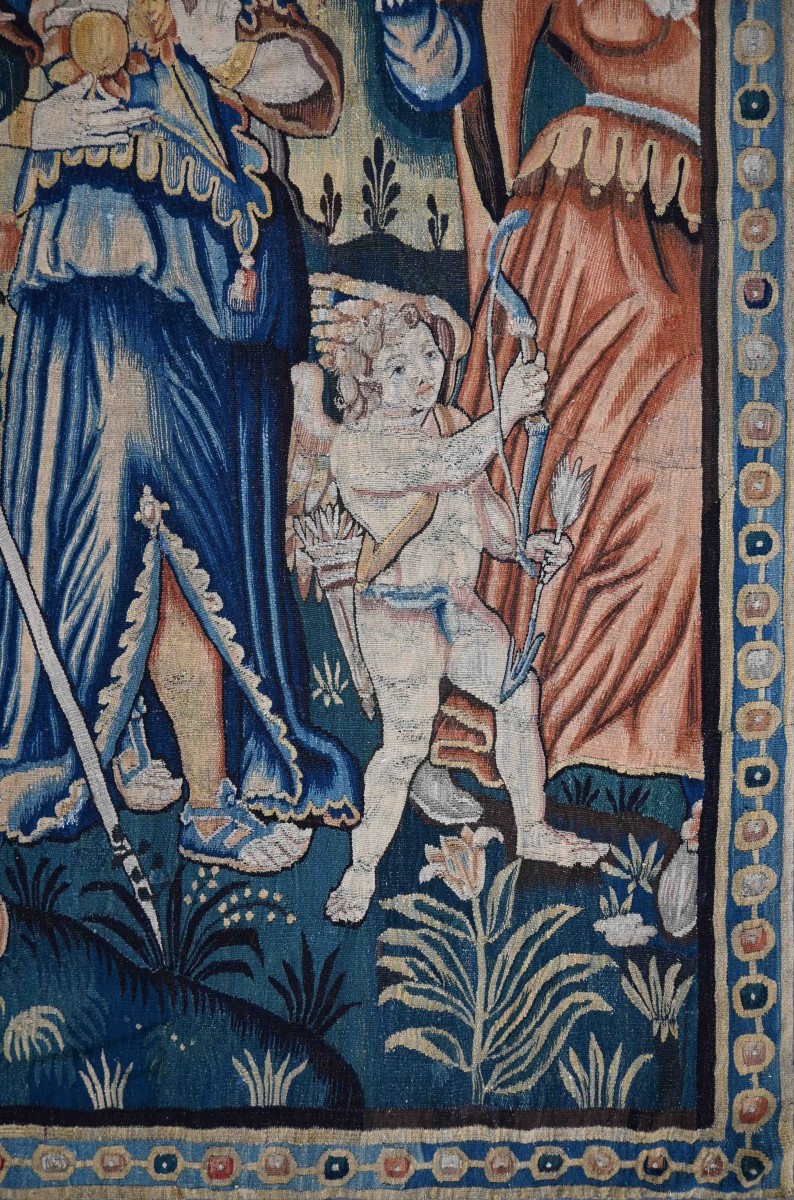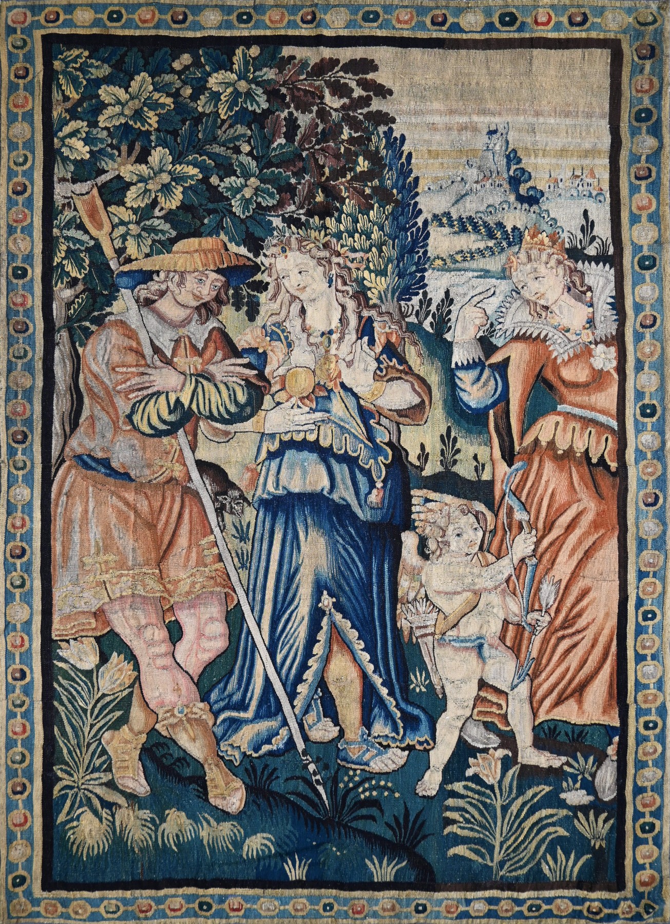 A beautiful Flemish tapestry depicting a gallant interpretation of the famous mythological episode of the Judgment of Paris. It shows Paris, a young Trojan shepherd, observing Venus, crowned with flowers and holding a golden apple, the symbol of her victory in the beauty contest between Hera and Athena. Beside her, Cupid brandishes his bow, a reminder that Venus won the judgment thanks to the promise she made to Paris: the love of the most beautiful woman in the world, Helen.