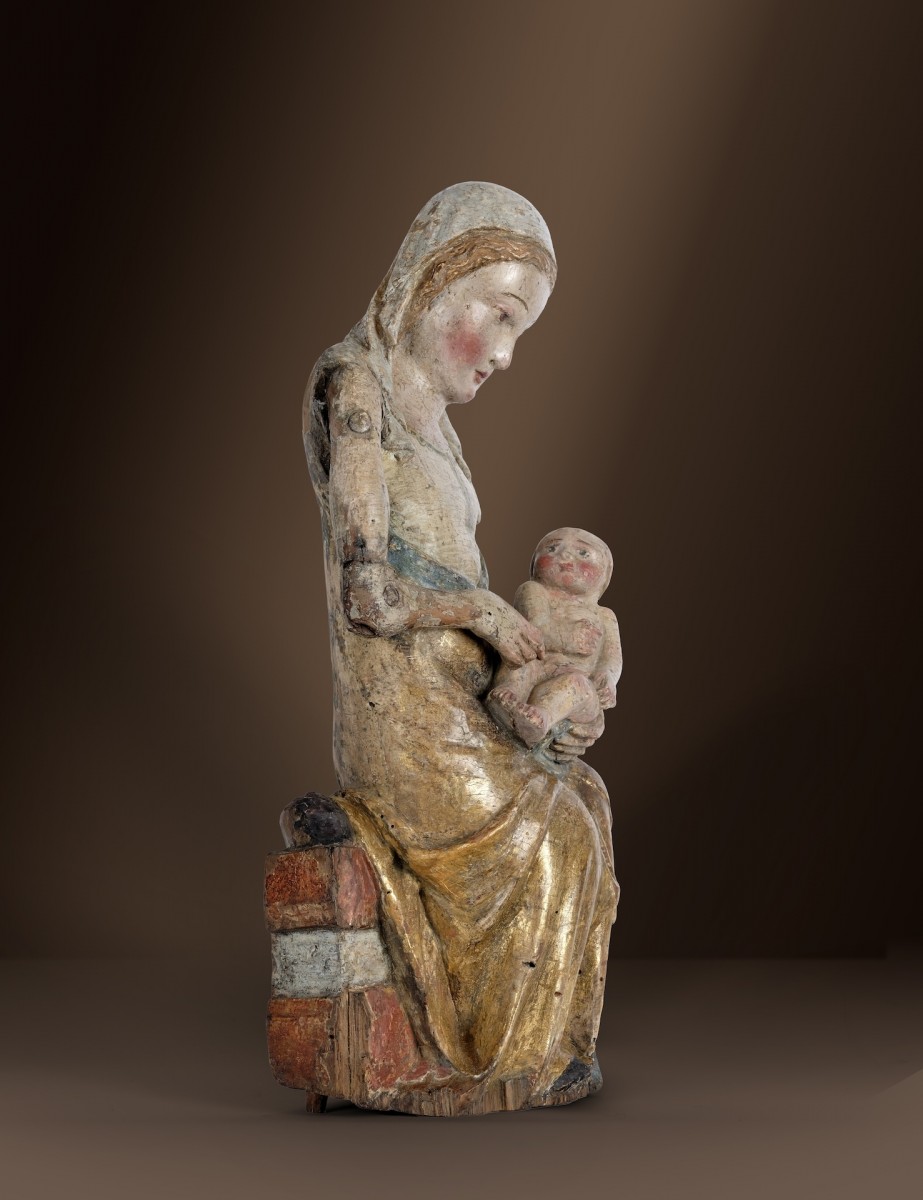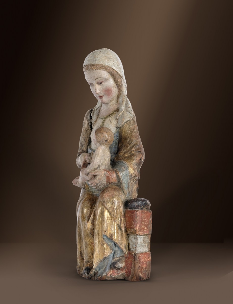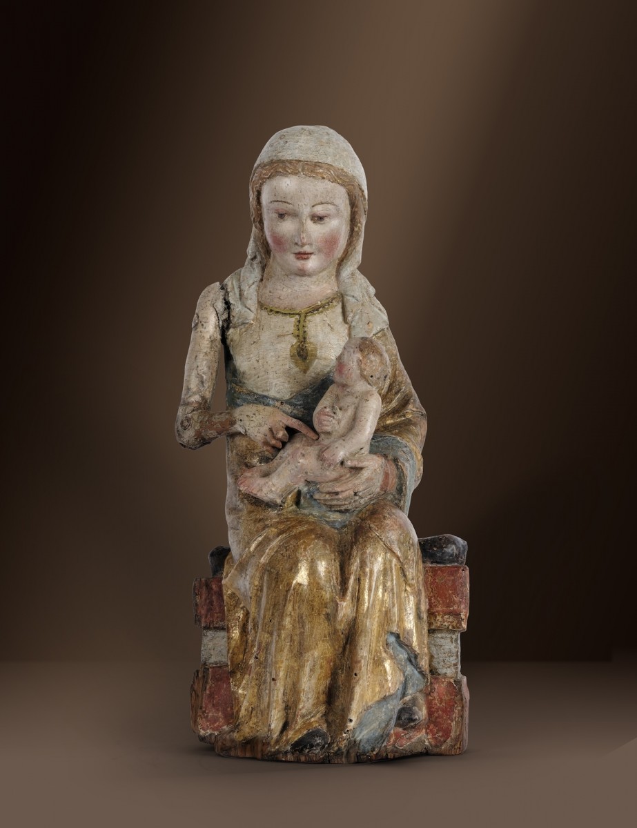 The present sculpture was created around 1330 and is carved from wood, with remnants of its original polychromy. Mary is seated on an expansive throne chair; the back is partially hollowed out in a rectangular shape, giving an indication of the production technique. Mary’s elongated torso is typical of this period and probably indicates that the figure was raised in a sacred space.
