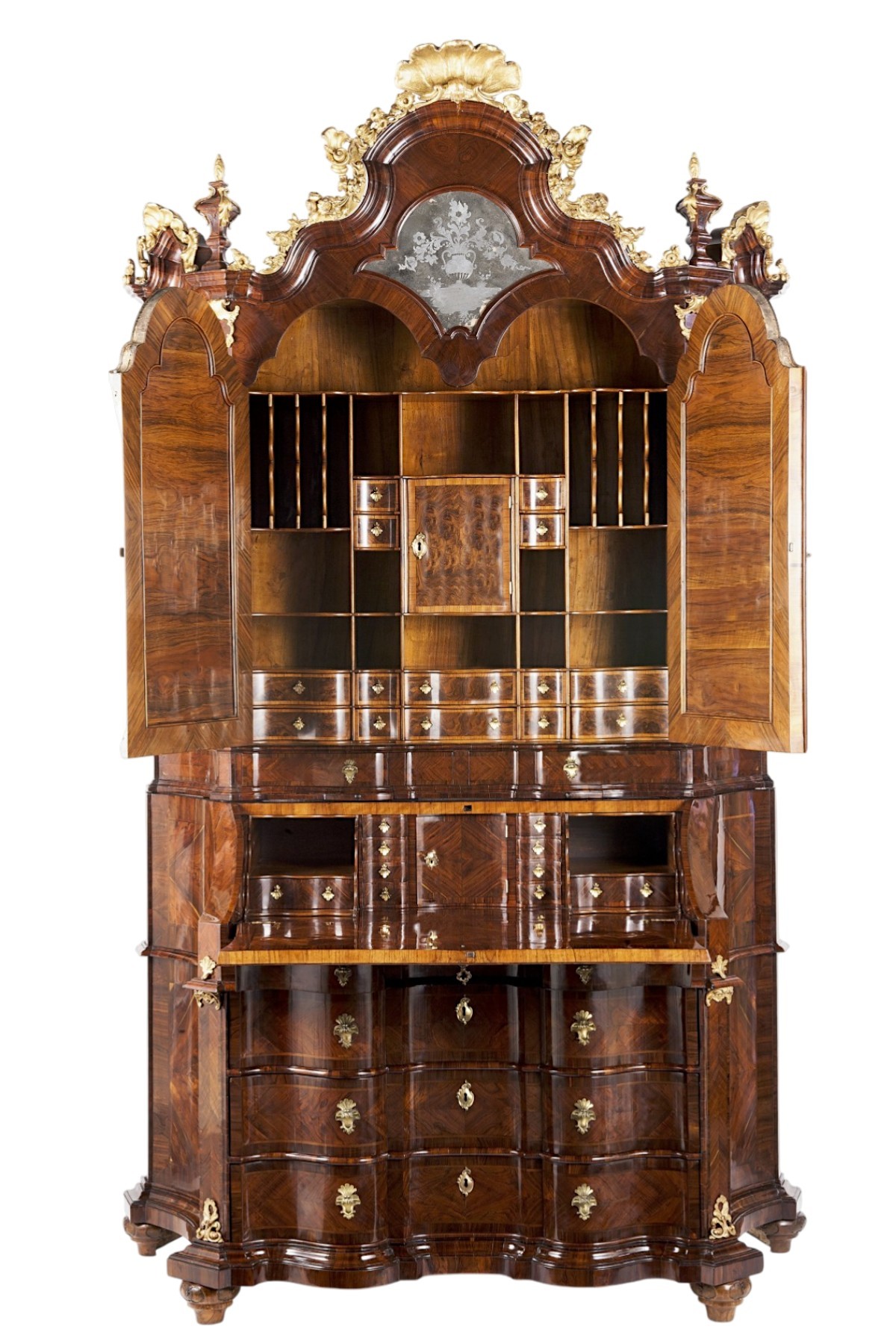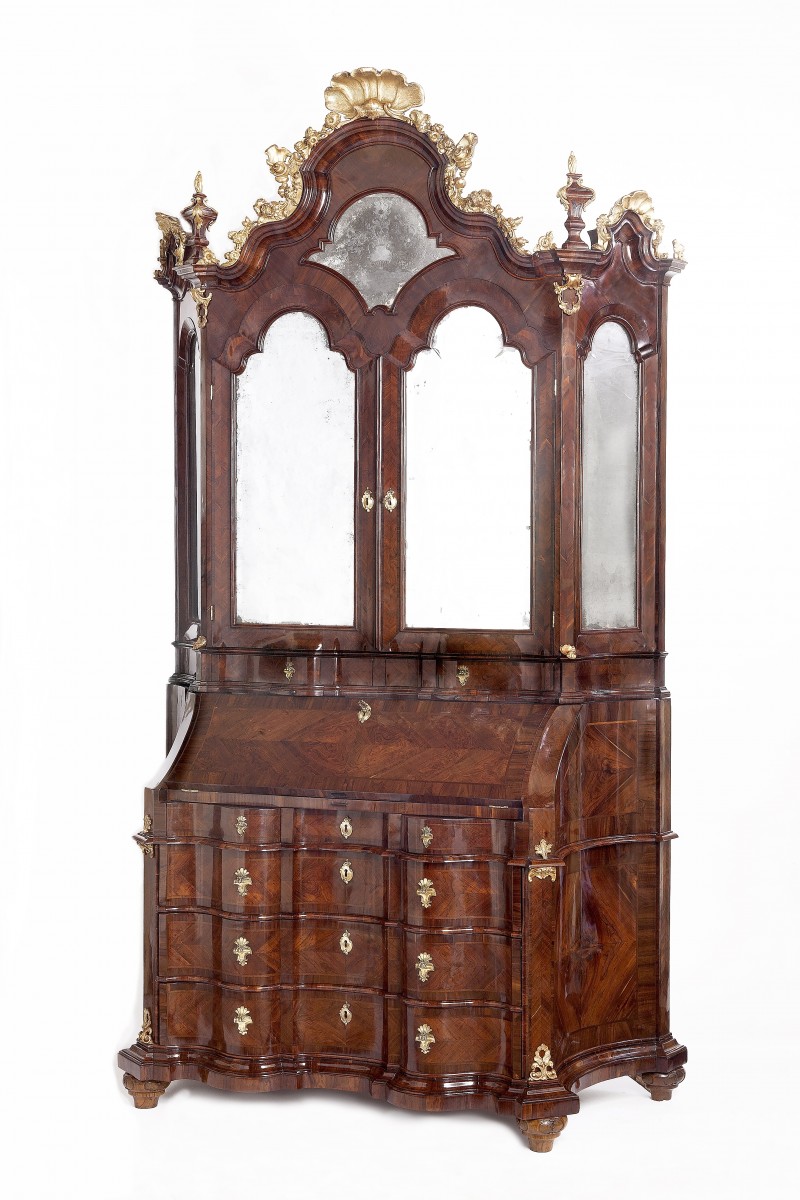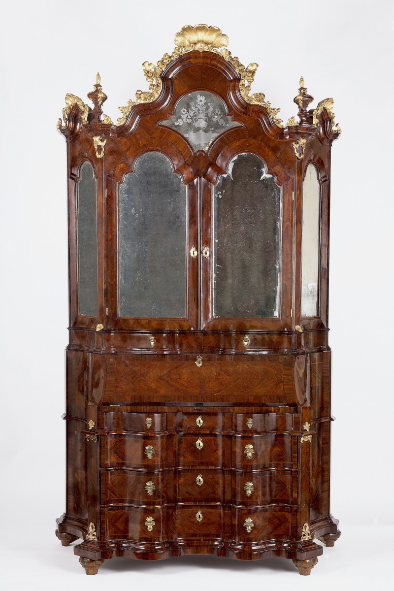 Important chest of drawers with a drop-down door and a raised shelf, veneered and trimmed in carob wood. The lower body, with a wavy front and concave sides that widen towards the back, features three large drawers and two lower ones under the drop-down door. The drop-down door reveals a particularly rich cabinet, composed of a shaped central door flanked by eight small drawers, pull-out compartments, and drawers. In the center, a sliding shelf conceals drawers and secret compartments. The upper body has two doors with shaped mirrors on the front and sides. Inside, the elaborate frame is made of solid wood and walnut burl; the tympanum is centered by an engraved mirror depicting a vase of flowers and crowned by a gilded wooden frieze; the handles are chiseled and gilded bronze; the onion-shaped feet are made of solid walnut with dotted reserves.