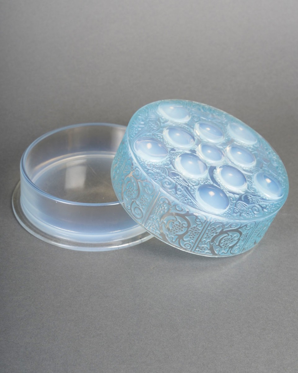 Box "Roger" made in opalescent glass with blue patina by René Lalique in 1926.
