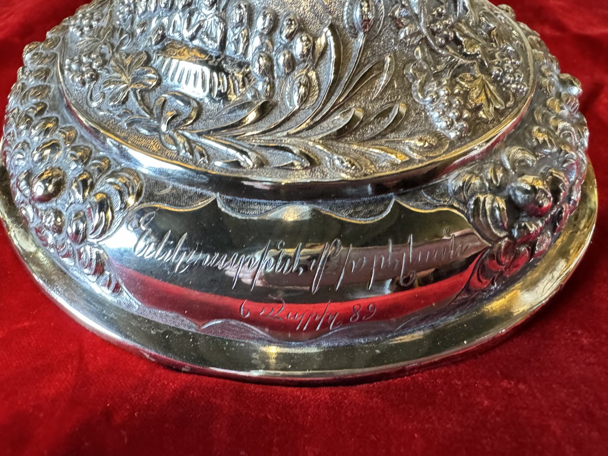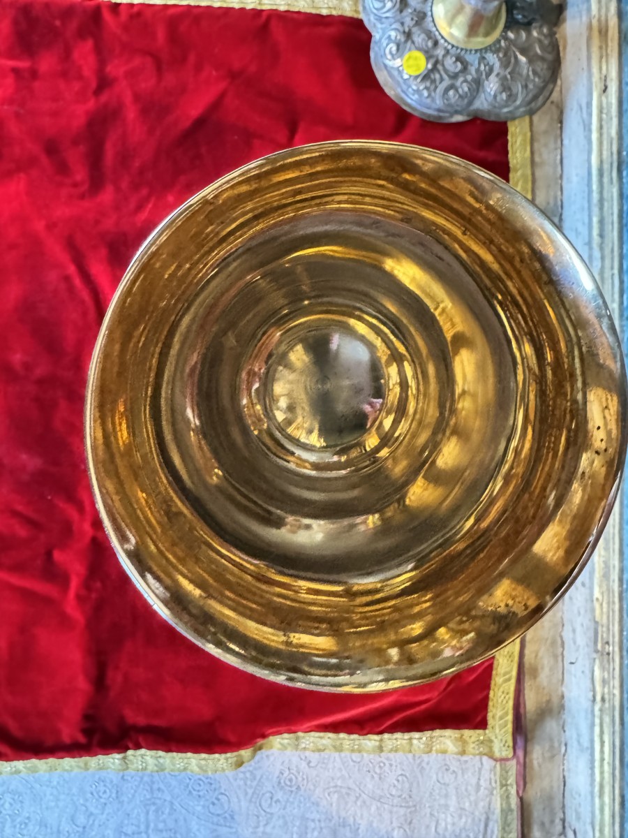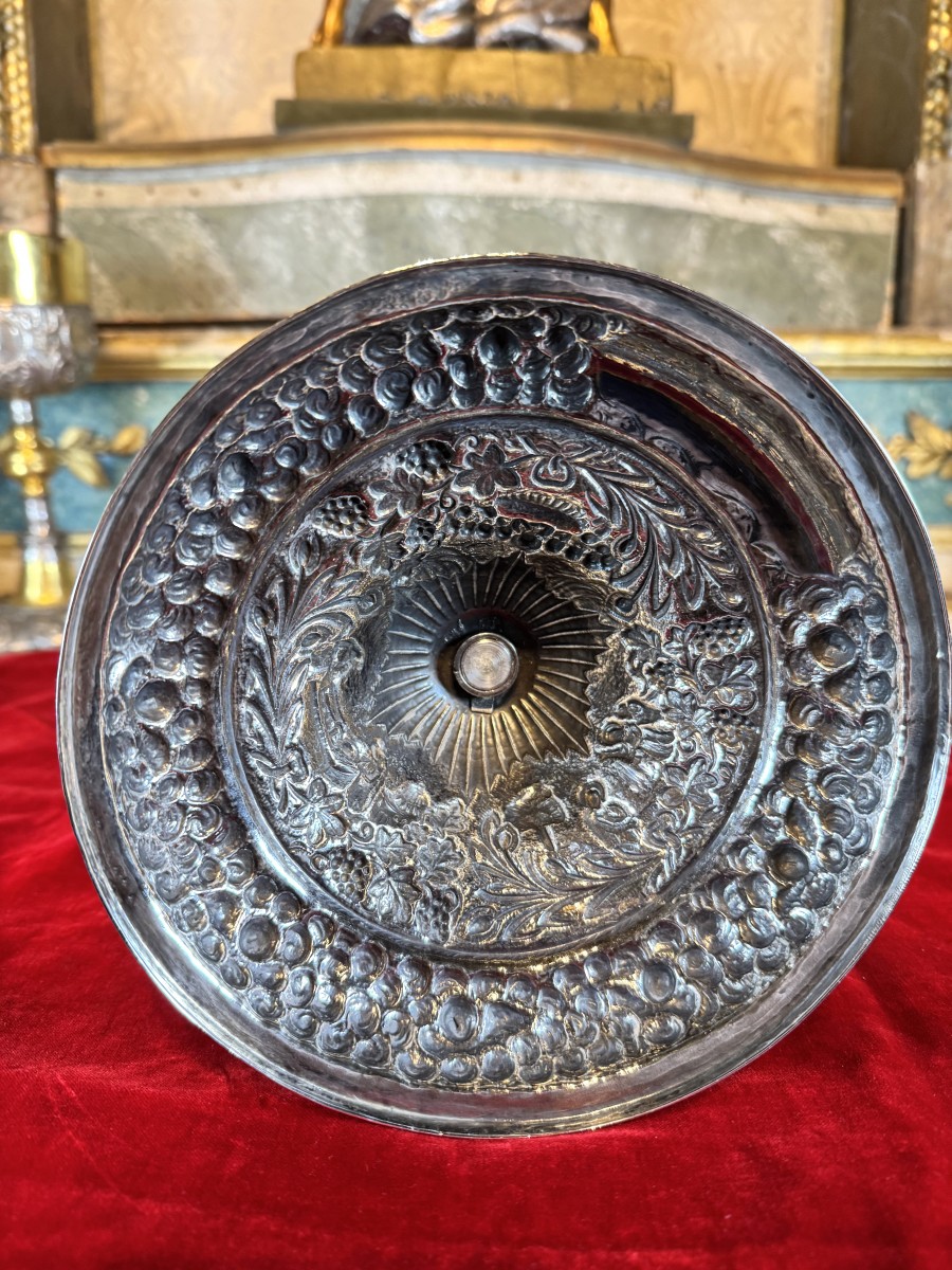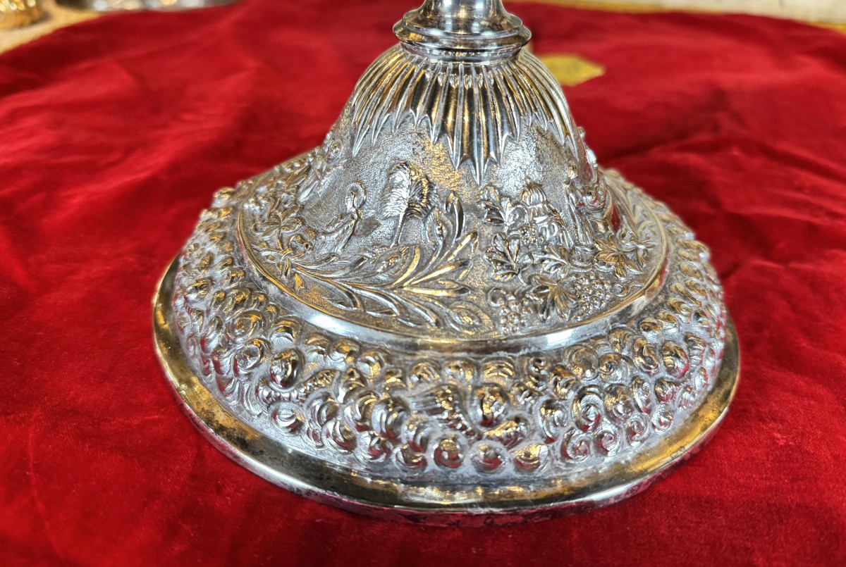The circular base is decorated with a delicate frieze of cherubs in a cloud. The foot is adorned with Eucharistic symbols as well as three rare depictions: Christ in the Garden of Gethsemane, the Last Supper, and the Entombment. A cartouche bears the Armenian inscription: Negdariné Koupélian, April 6, 1889. Dimensions: 31 cm, weight: 698 grams.