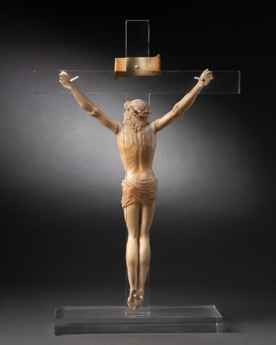 This beautiful 18th-century ivory Christ is mounted on a plexiglass cross (H. 40.5 cm; W. 27 cm). It is finely sculpted, particularly the crown of thorns and the face, whose expression shows a certain serenity in the face of suffering.