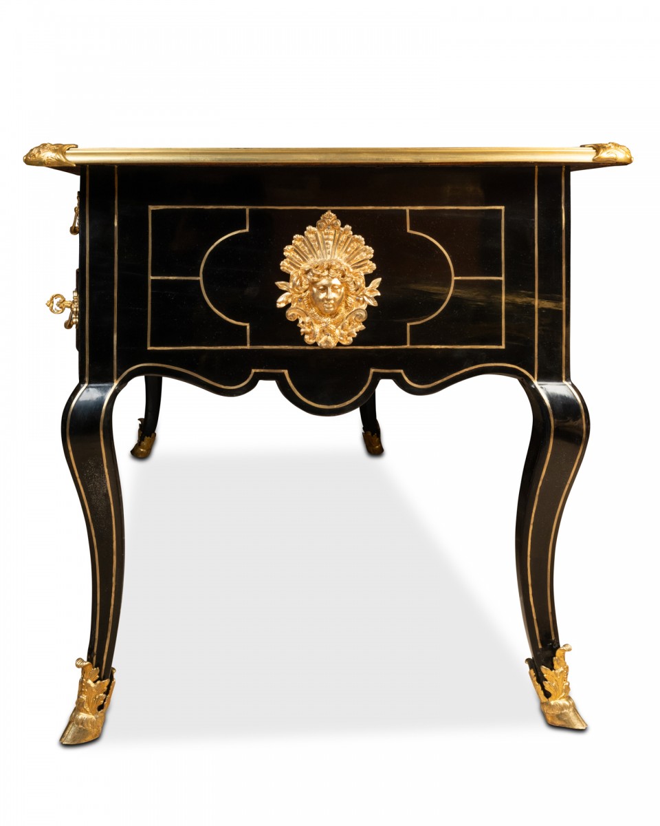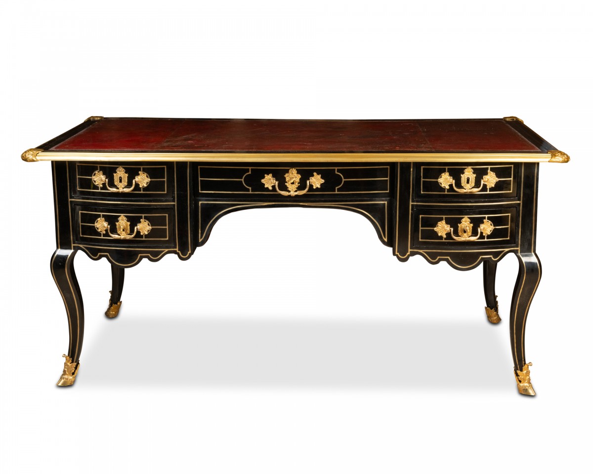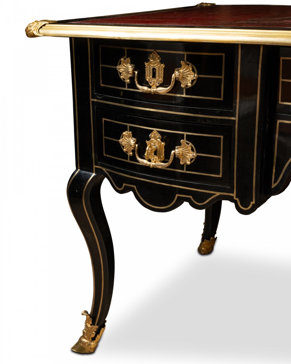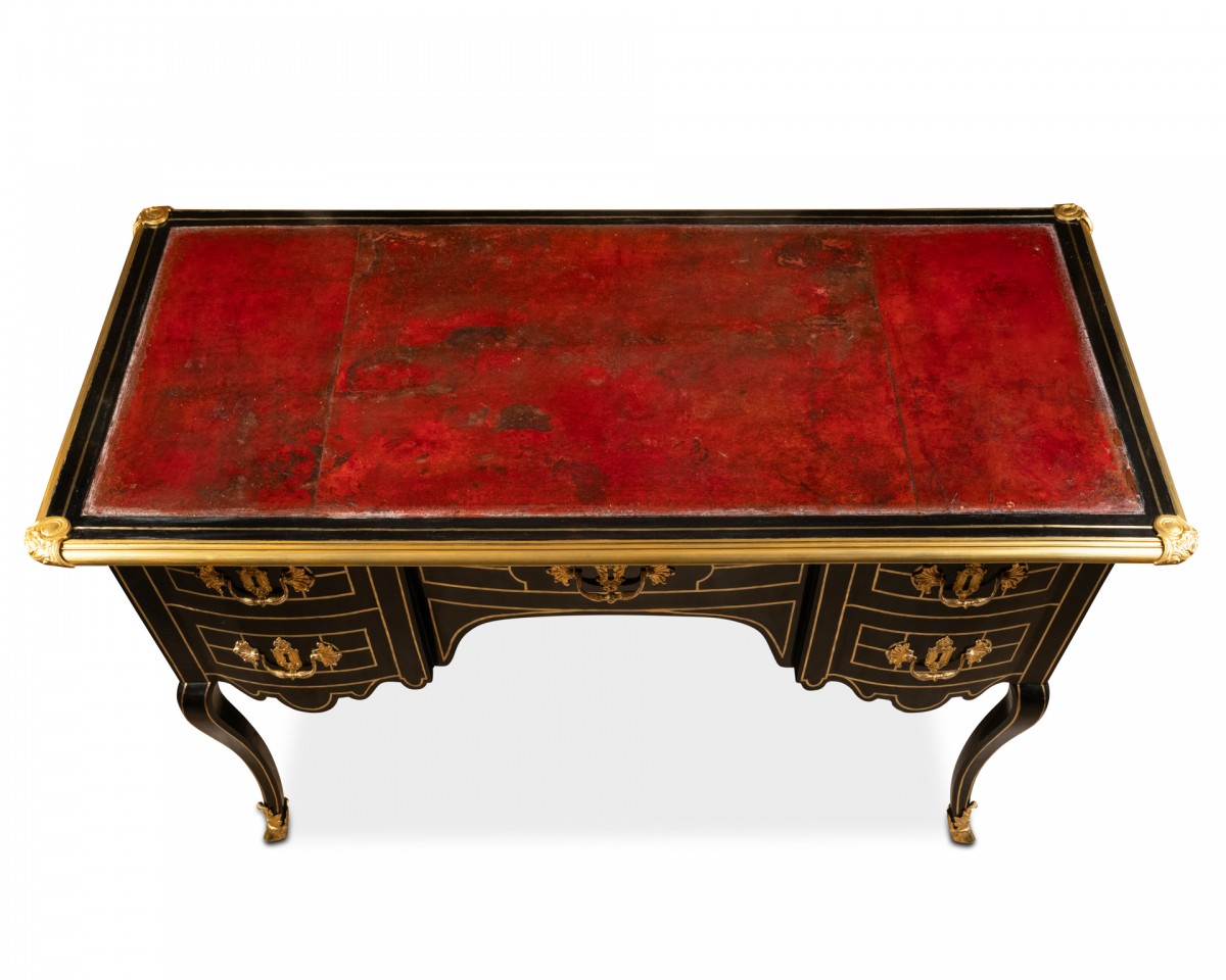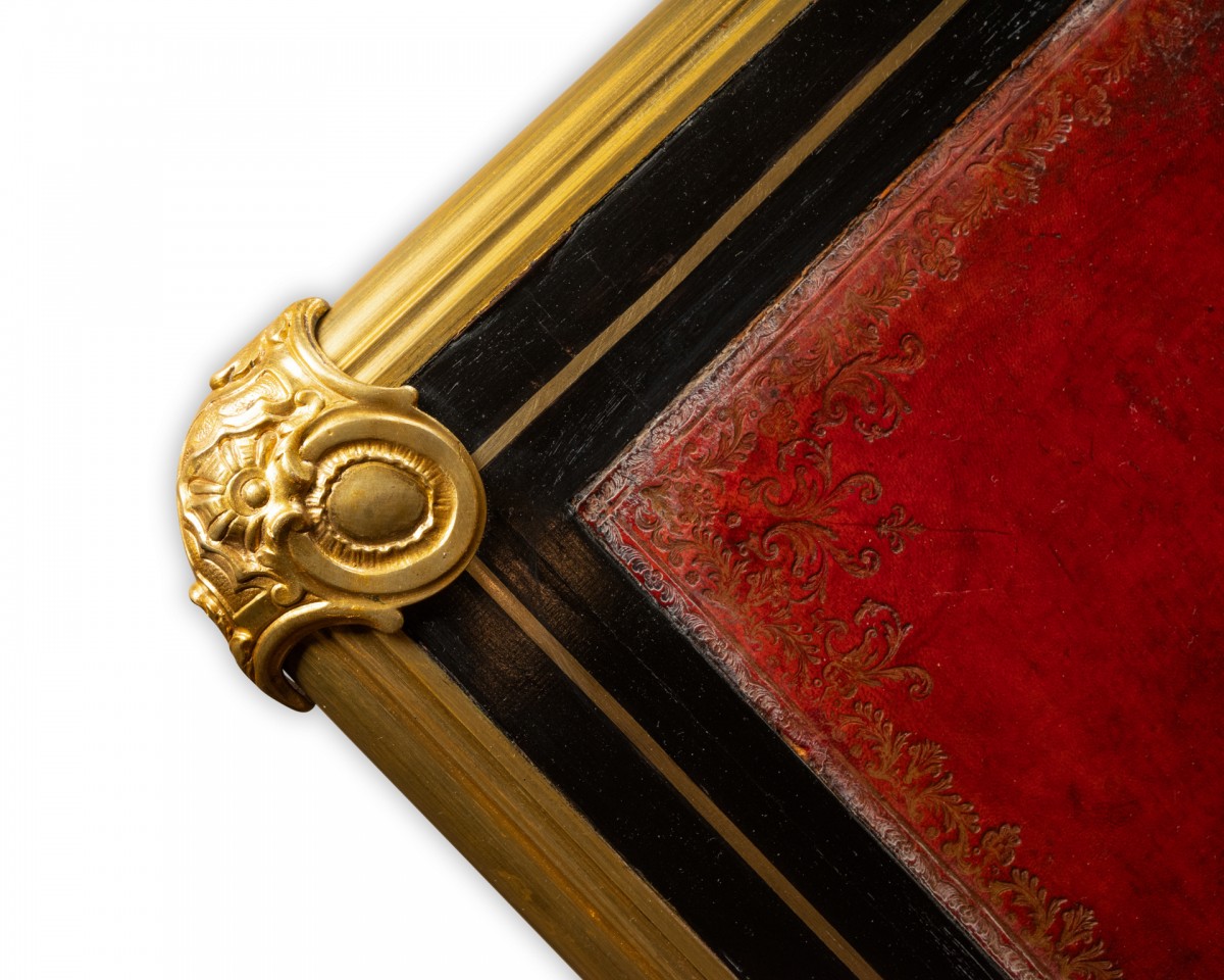 The top is covered in dark garnet leather and surrounded by blackened pear wood with filigree, and edged with a gilt bronze moulding with a corbel and spandrels.