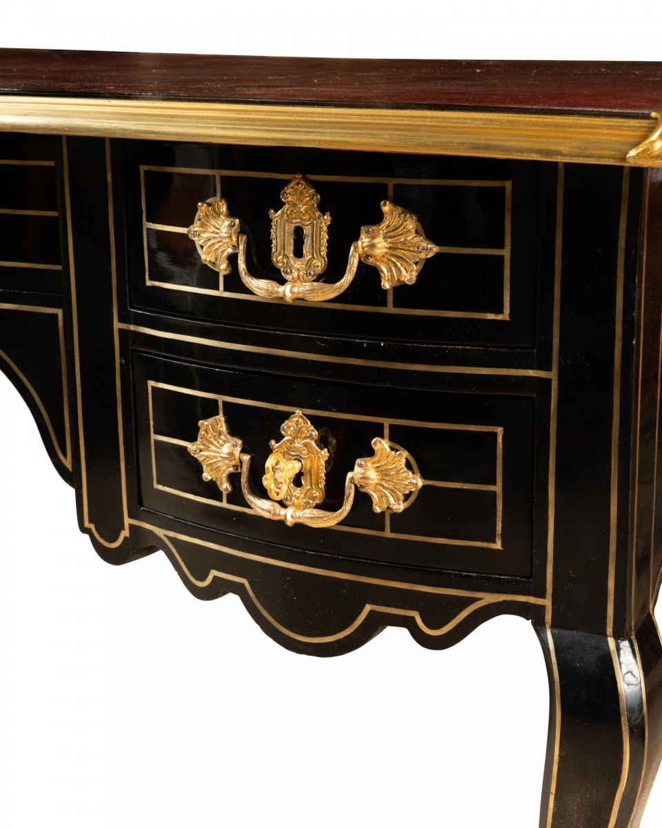 Desk with blackened pear wood on all sides and geometric brass inlay decorations, resting on four curved legs. It opens with five drawers, a recessed central drawer separating the other curved drawers, giving rhythm to the front and greater comfort for the user. The back has exactly the same layout.