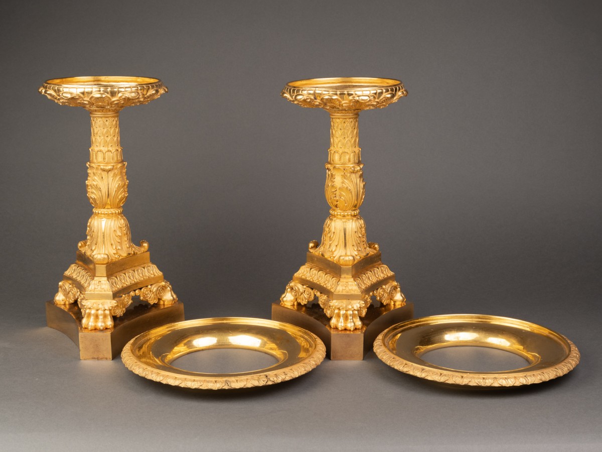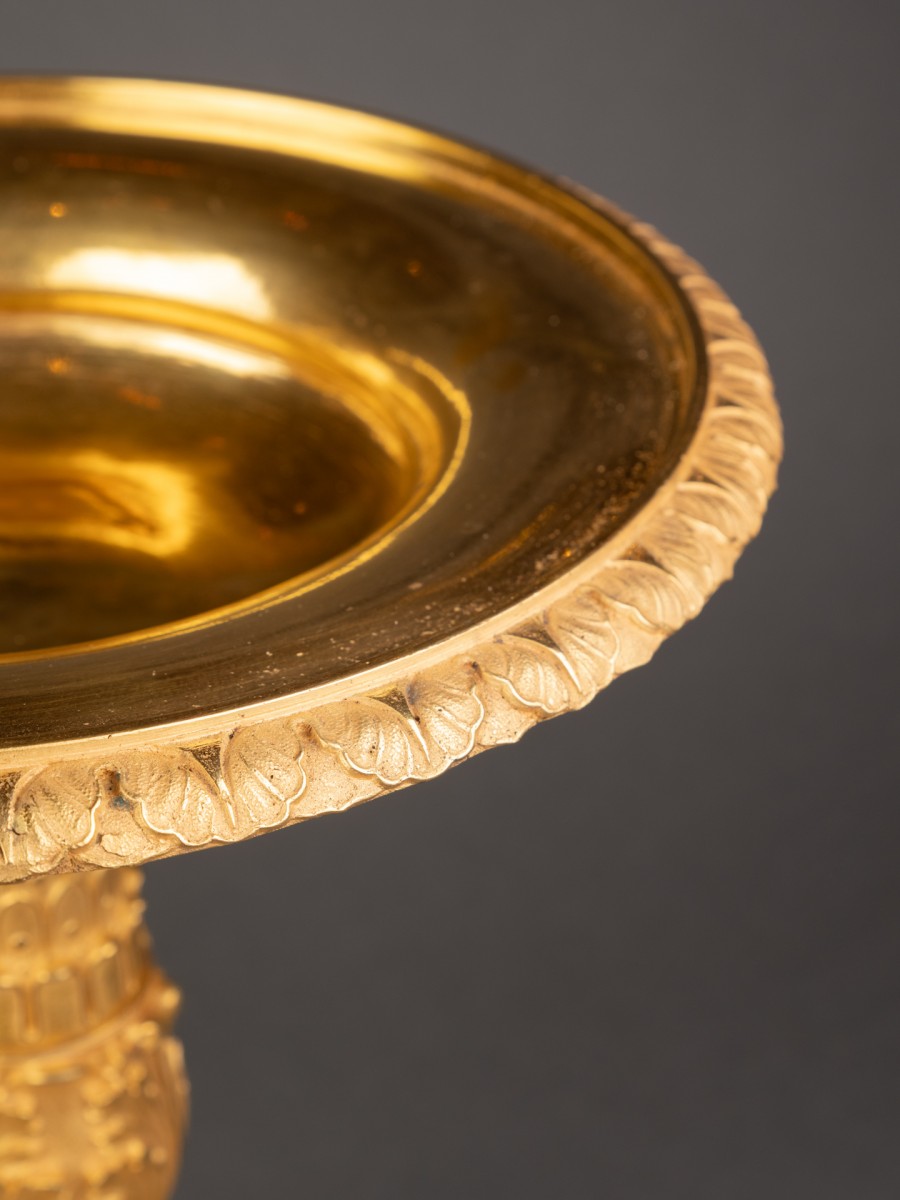 Pair of table bowls, in finely chiselled gilt bronze; the baluster shaft decorated with acanthus leaves and large volutes ending in lion's claws supports a gadrooned basin.
